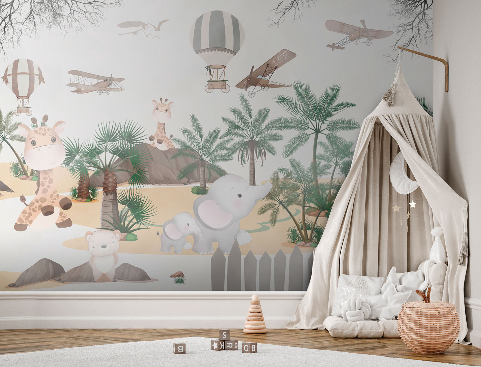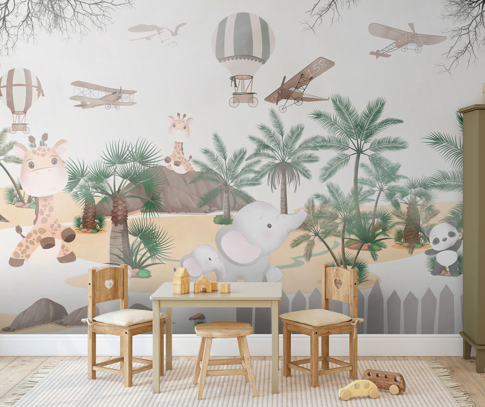 Predstavte si, že sa detská izba premení na snové safari dobrodružstvo! Presne to získate s nástennou maľbou “Žirafa s palmami”. Táto očarujúca fototapeta zobrazuje rozkošné žirafy s pozadím bujných paliem, hravých slonov a dokonca aj balónov a lietadiel, ktoré sa vznášajú okolo. Je to ako vstúpiť do nežnej džungle priamo z rozprávkovej knihy.