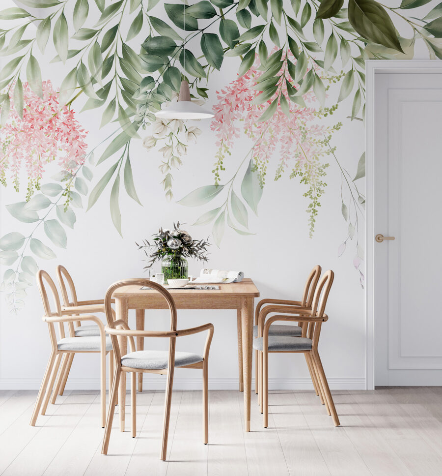 Predstavte si, že vojdete do miestnosti a okamžite sa upokojíte touto elegantnou kvetinovou nástennou maľbou. Jemné ružové a zelené odtiene sa kaskádovito rozlievajú po stene ako jemný záhradný vánok. Je to dokonalá kombinácia – moderná a zároveň nadčasová. Skvele sa hodí do obývačky, spálne alebo aj do štýlovej domácej kancelárie. Vďaka jemným lístkom a kvetom sa možno budete cítiť ako v slnečnej botanickej záhrade, a to aj počas tých najdaždivejších dní. Ak teda chcete svojmu priestoru dodať nádych kúzla inšpirovaného prírodou, táto nástenná maľba môže byť presne to, čo potrebujete.