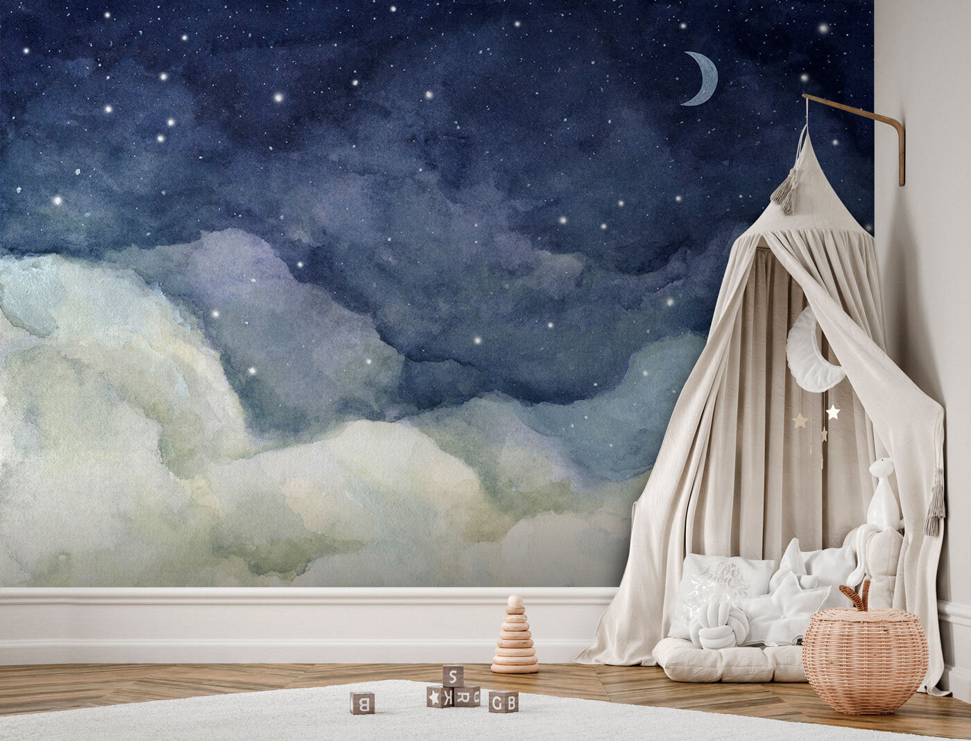 Premeňte akúkoľvek stenu na zasnený únik s touto očarujúcou nástennou maľbou mrakov a hviezd. Predstavte si pokojnú oblohu, na ktorej sa môžu malé deti unášať do svojich vlastných dobrodružstiev, hľadiac na mäkké, nadýchané obláčiky a trblietajúce sa hviezdy. Je to ako mať kúsok nočnej oblohy priamo vo svojej izbe! Táto nástenná maľba je ideálna do detského priestoru a dodáva mu rozmarný nádych, ktorý podnecuje predstavivosť. Či už ide o rozprávky pred spaním, polnočné behy na občerstvenie alebo snívanie, táto nástenná maľba vytvára útulnú atmosféru, ktorá je tá správna. Premeňte tieto steny na zázračné plátno, kde každý pohľad nabáda k novému príbehu. Aký fantastický spôsob, ako inšpirovať kreativitu a lásku k nočnej oblohe!