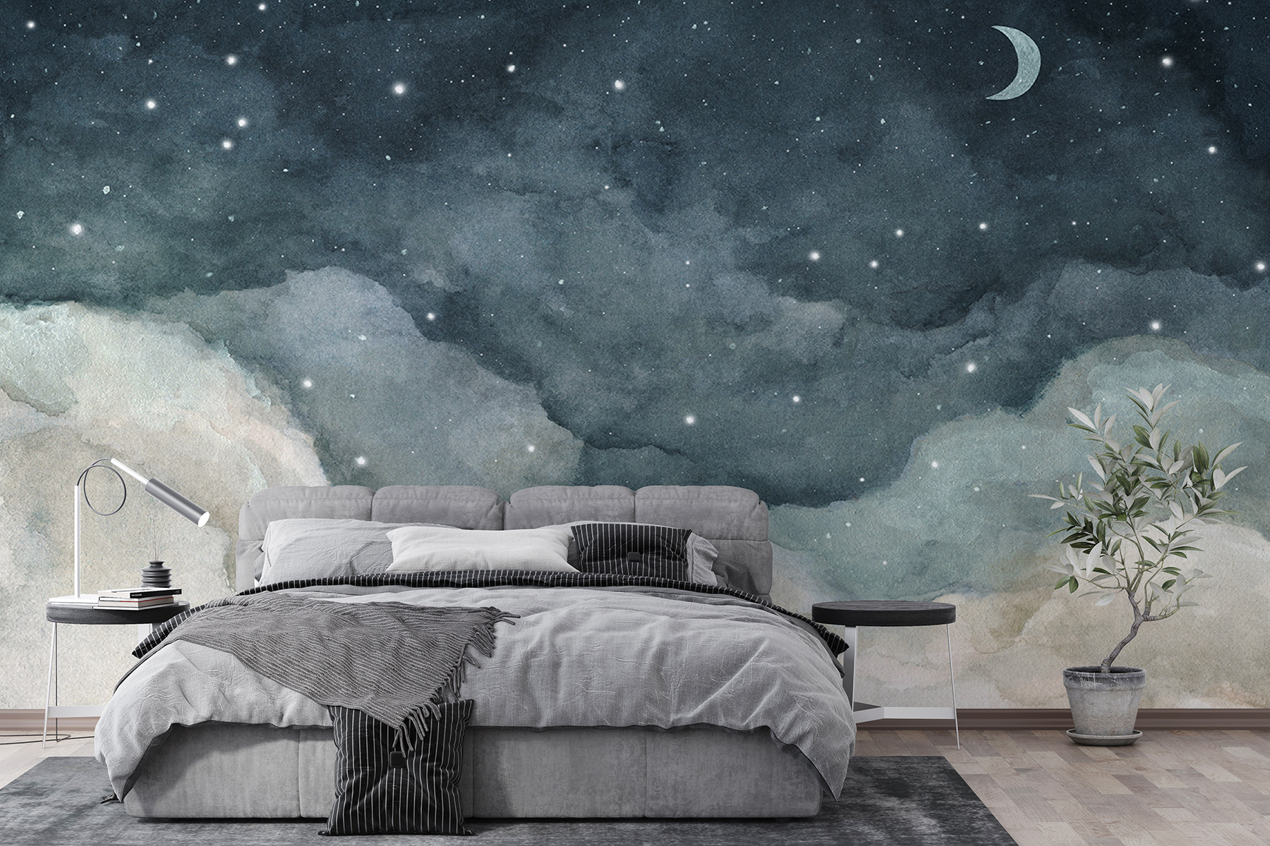 Má jemnú akvarelovú atmosféru, vďaka ktorej všetko pôsobí pokojne a magicky. Tie pokojné oblaky a roztrúsené hviezdy? Úplne upokojujúce. Je to ako mať v interiéri svoj vlastný kúsok nočnej oblohy. Deti (a úprimne, aj dospelí) budú radi zaspávať pod touto nebeskou scenériou. Hovoríme o pozadí na rozprávky pred spaním!