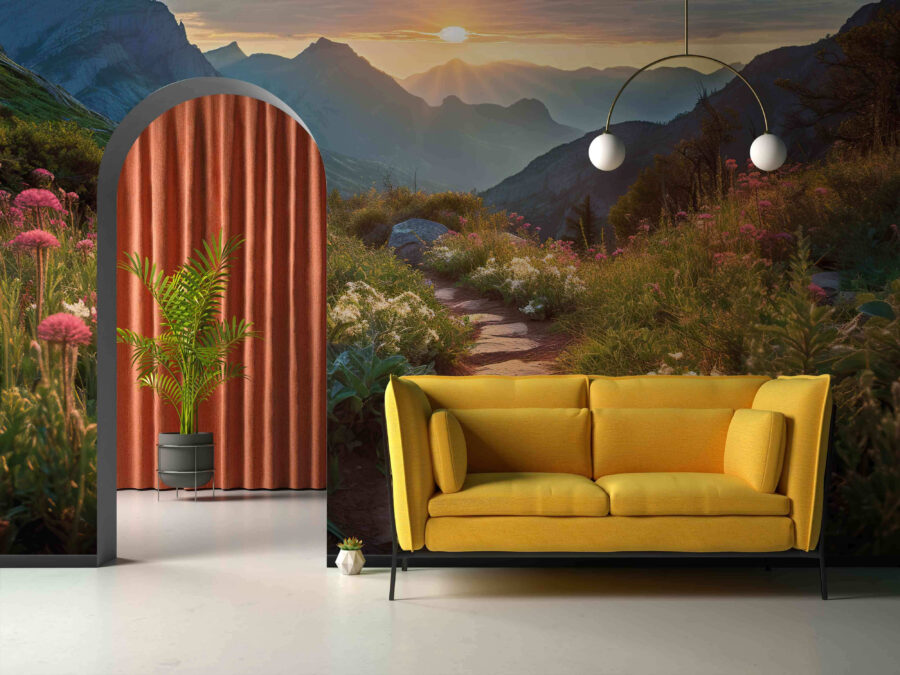 Objavte každodenný pokoj s našou nástennou maľbou “Horská cesta pri východe slnka”. Dokonale zachytáva pokojný okamih, keď slnko začína stúpať a vrhá teplé lúče na pokojnú horskú cestu posiatu divokými kvetmi. Takmer počujete jemné šumenie ranného vánku? Táto nástenná maľba je ideálna pre milovníkov prírody, ktorí túžia po dotyku prírody v interiéri – skvelá na relaxáciu po dlhom dni. Predstavte si, že si vychutnávate rannú kávu s takýmto úžasným pozadím! Pocíťte čerstvý horský vzduch a nechajte tento úchvatný výhľad premeniť každú miestnosť na útulné útočisko.