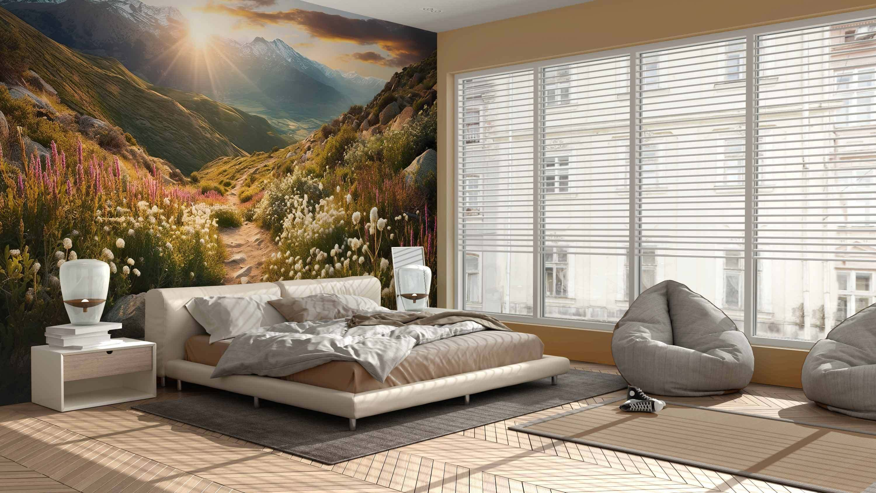 Pomocou nástennej maľby Západ slnka nad horským kvetinovým chodníkom premeníte fádny priestor na zasnené útočisko. Predstavte si, že vstúpite do pokojného sveta, kde živé divoké kvety tancujú vo vetre a majestátne hory sa tiahnu do nekonečna. Táto nástenná maľba vás vyzýva, aby ste sa hlbšie nadýchli, pocítili teplo západu slnka a prijali pokoj prírody priamo u vás doma.