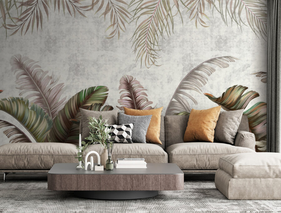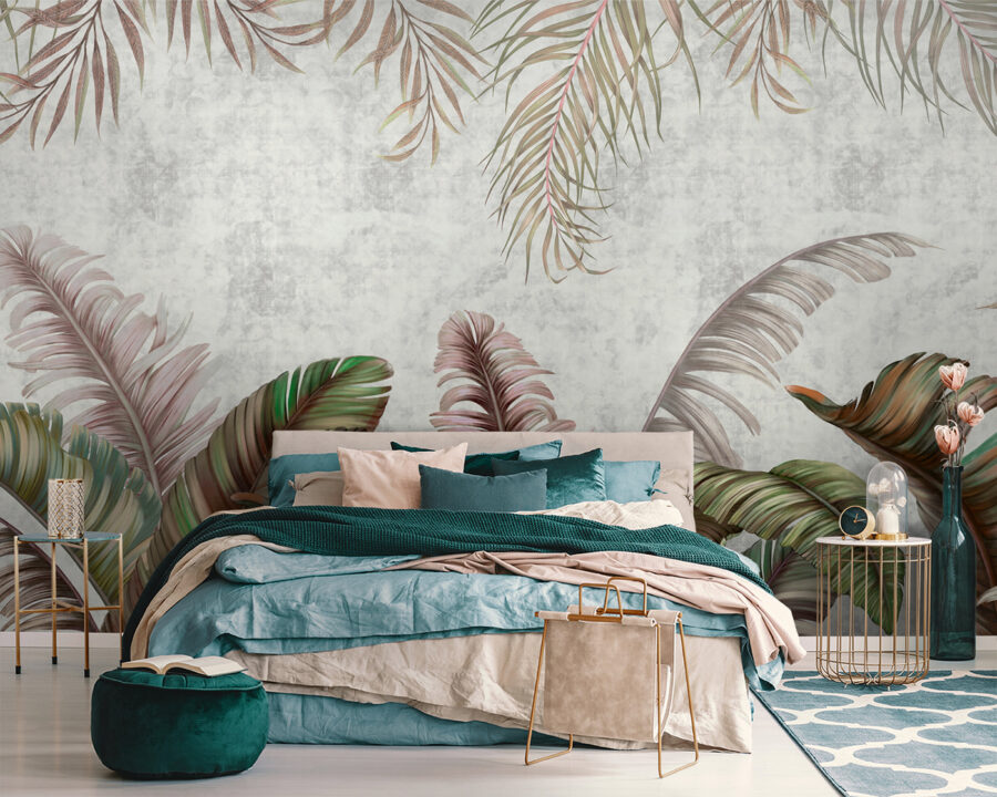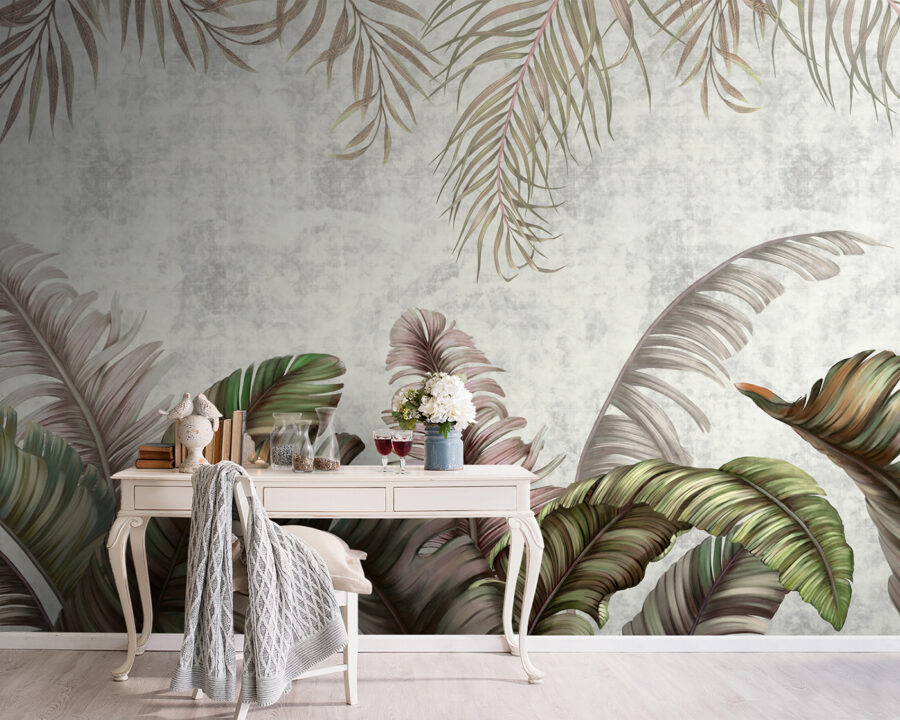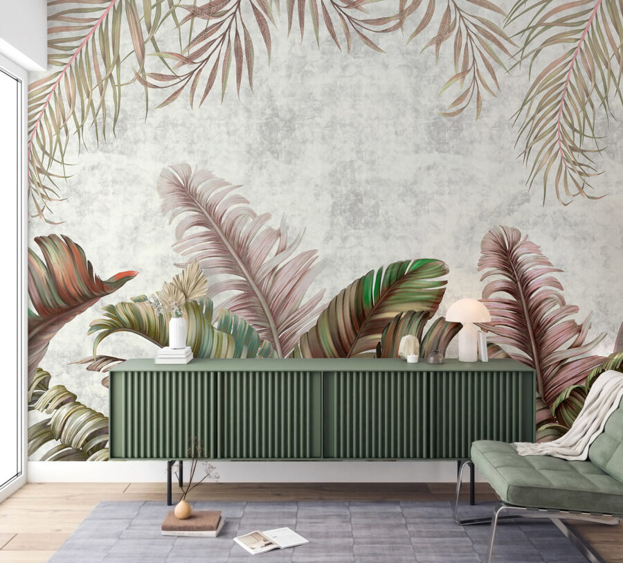 Premeňte akúkoľvek miestnosť pomocou úžasnej nástennej maľby “Tropické listy s pastelovými odtieňmi”. Táto nástenná maľba navodzuje sviežu atmosféru, ktorá je upokojujúca a osviežujúca – ideálna na snívanie alebo na schúlenie sa pri dobrej knihe. Predstavte si, ako popíjate kávu v slnkom zaliatom kúte, obklopení nadrozmernými listami v jemných zelených a ružových tónoch, vďaka ktorým sa každý okamih bude cítiť ako mini dovolenka. Je to ako preniesť si kúsok raja do interiéru bez komárov. Táto nástenná maľba, ideálna do útulnej obývačky alebo na temperamentnú stenu galérie, dodáva osobnosť a teplo. Tak prečo nedať týmto stenám trochu lásky?