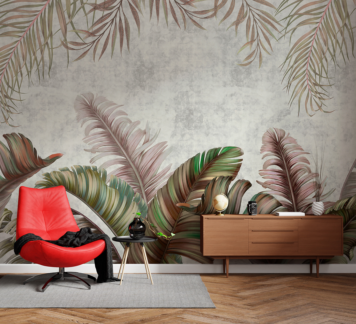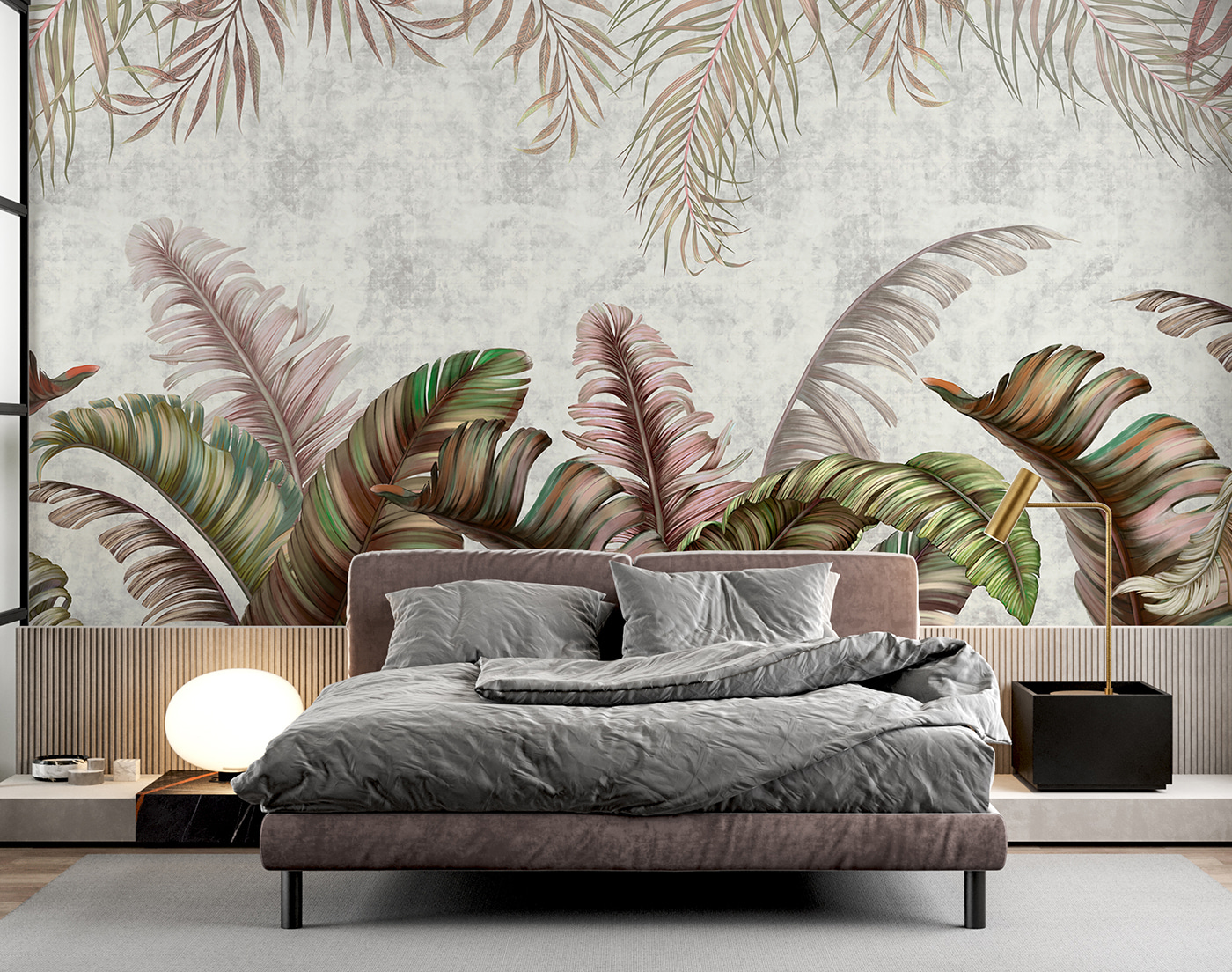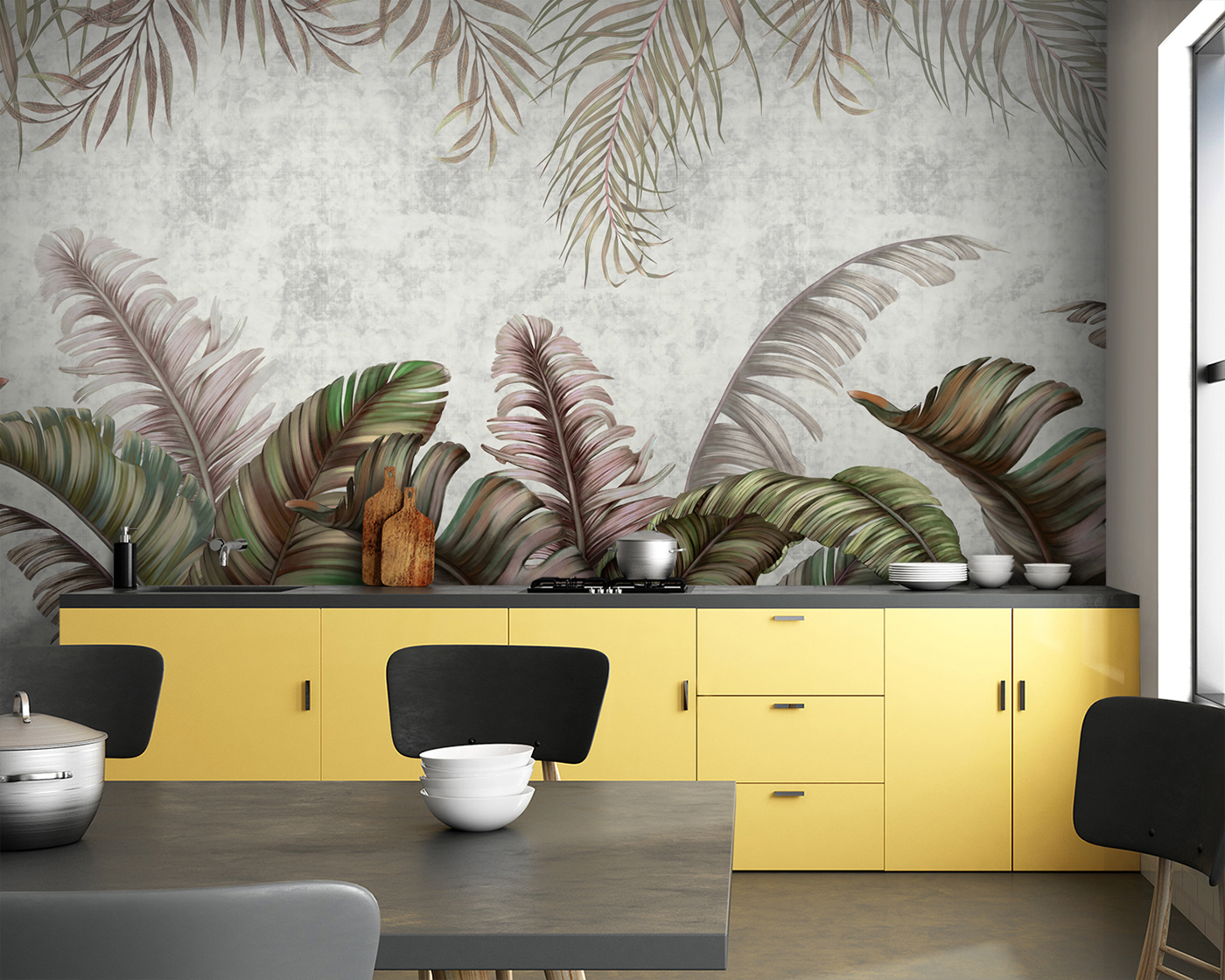 Premeňte akúkoľvek miestnosť pomocou úžasnej nástennej maľby “Tropické listy s pastelovými odtieňmi”. Táto nástenná maľba navodzuje sviežu atmosféru, ktorá je upokojujúca a osviežujúca – ideálna na snívanie alebo na schúlenie sa pri dobrej knihe. Predstavte si, ako popíjate kávu v slnkom zaliatom kúte, obklopení nadrozmernými listami v jemných zelených a ružových tónoch, vďaka ktorým sa každý okamih bude cítiť ako mini dovolenka. Je to ako preniesť si kúsok raja do interiéru bez komárov. Táto nástenná maľba, ideálna do útulnej obývačky alebo na temperamentnú stenu galérie, dodáva osobnosť a teplo. Tak prečo nedať týmto stenám trochu lásky?