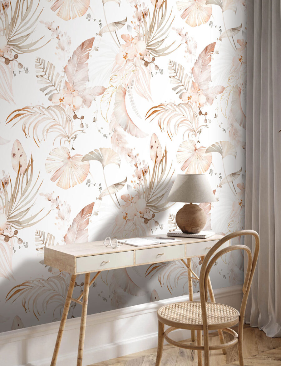Predstavte si, že vstúpite do miestnosti, kde steny kvitnú životom – práve to vám ponúka táto „nástenná maľba s motívom kvetov a listov“! Je to nádherný tanec jemných kvetov a elegantných listov, ktorý vyžaruje útulnú, slnečnú atmosféru, ktorá vás núti siahnuť po šálke čaju a relaxovať. Je ideálna do obývacej izby alebo do spálne snov, je to ako mať tajnú záhradu priamo doma. Priatelia sa zastavia uprostred vety, očarení touto krásou. A buďme úprimní, kto by nechcel mať pocit, že je na večnom pobyte v prírode? Jemné farby tejto tapety dýchajú teplo a pokoj a premenia každý priestor na oázu.
