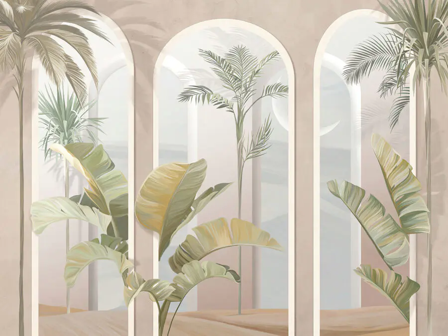 Predstavte si, že pri každom vstupe do izby vstúpite do pokojného útočiska. Freska na stenu “Oblúkové okná s tropickými rastlinami” má túto atmosféru dokonale vyladenú. Je to ako váš osobný únik do tropického raja bez toho, aby ste museli opustiť svoj domov. Tlmená zeleň sviežich listnatých rastlín akoby ožívala cez elegantné oblúky a ponúka relaxačný nádych. Navyše tieto jemné oblúky fantasticky zväčšujú priestor – akoby ste sa pozerali do vysnívaného letoviska!
