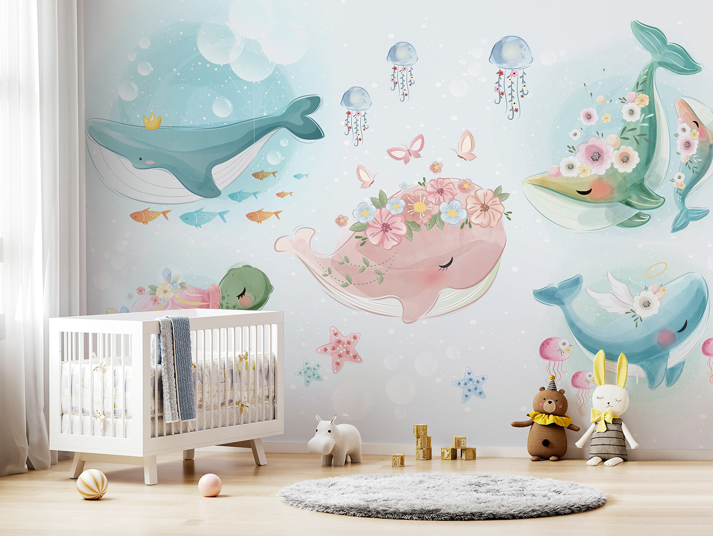 Je navrhnutý pre detské priestory, vaša dcéra ho bude zbožňovať a dojčatá budú uchvátené jeho nežnými farbami a hravými postavičkami. Je to ako mať podmorskú rozprávku priamo na stene. Vďaka jemným, zasneným farbám a rozkošným detailom je taký upokojujúci – ako teplé objatie od samotného mora! Ideálne sa hodí do detských izieb alebo herní a možno sa stane kulisou pre nespočetné rozprávky pred spaním a nápadité hry. Kto by nechcel, aby naňho počas spánku dohliadala veľryba? Táto nástenná maľba má v sebe napísané kúzlo.