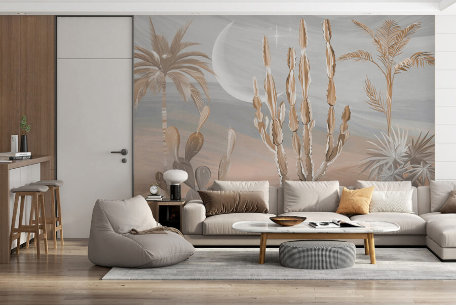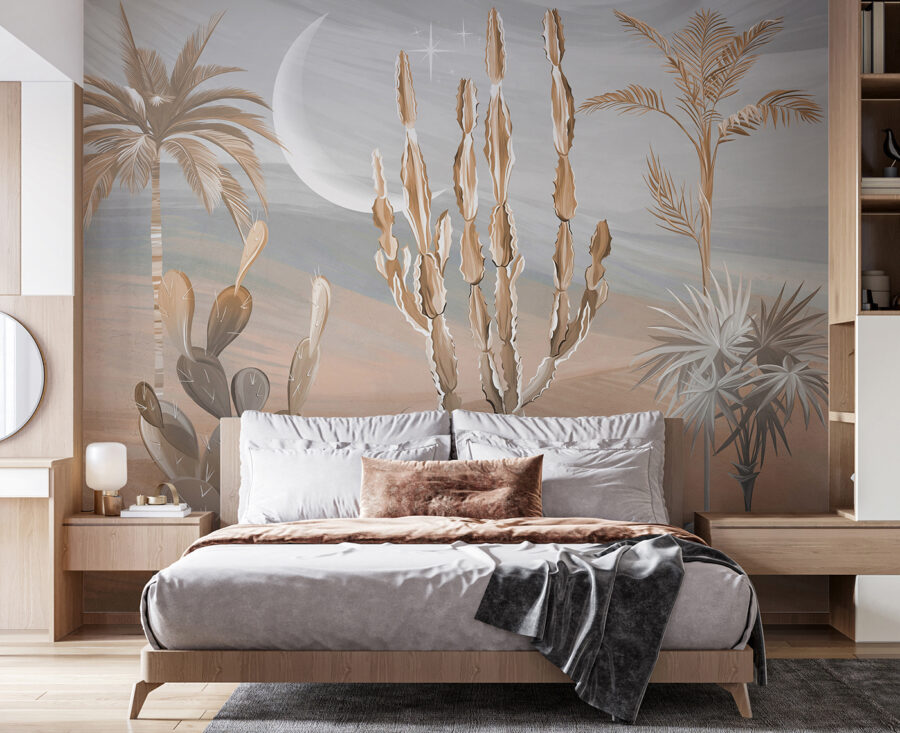 Pozrite si túto radikálnu nástennú maľbu! Predstavte si, že si do obývačky prenesiete kúsok púšte – kaktusy, palmy a tú zasnenú krajinu. Je to ako vstúpiť do pokojnej oázy bez spaľujúceho tepla a pichľavých rastlín. Ideálne na dodanie nádychu putovania do akéhokoľvek priestoru.