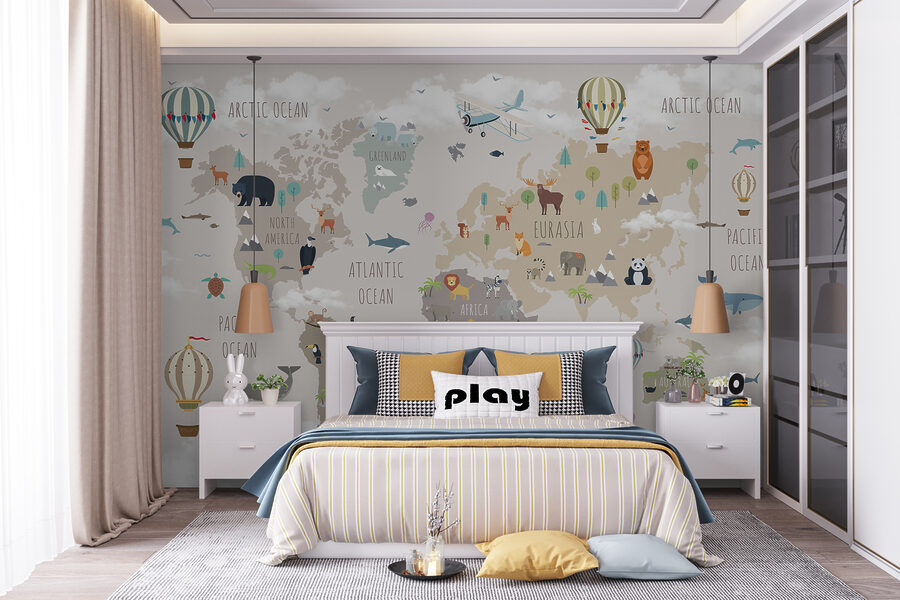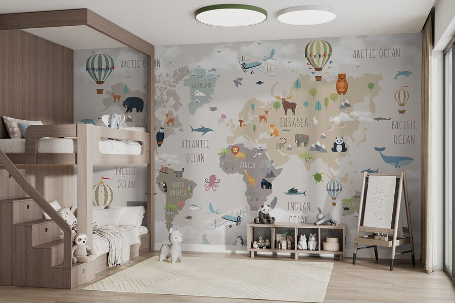 Táto nástenná maľba nie je len dekoráciou – je to celý zážitok. Deti sa môžu dozvedieť o rôznych kontinentoch a oceánoch a zároveň si všimnúť svoje obľúbené zvieratá, od ľadových medveďov v Grónsku až po klokany v Austrálii. Tlmené farby sú upokojujúce, ideálne na rozprávky pred spaním alebo lenivé nedeľné popoludnia. Je to druh dekoru, ktorý podnecuje predstavivosť a zvedavosť, takže sa skvele hodí do detských izieb, herní alebo dokonca tried. Navyše, každý deň si môžete všimnúť nové detaily, ktoré udržia kúzlo pri živote.