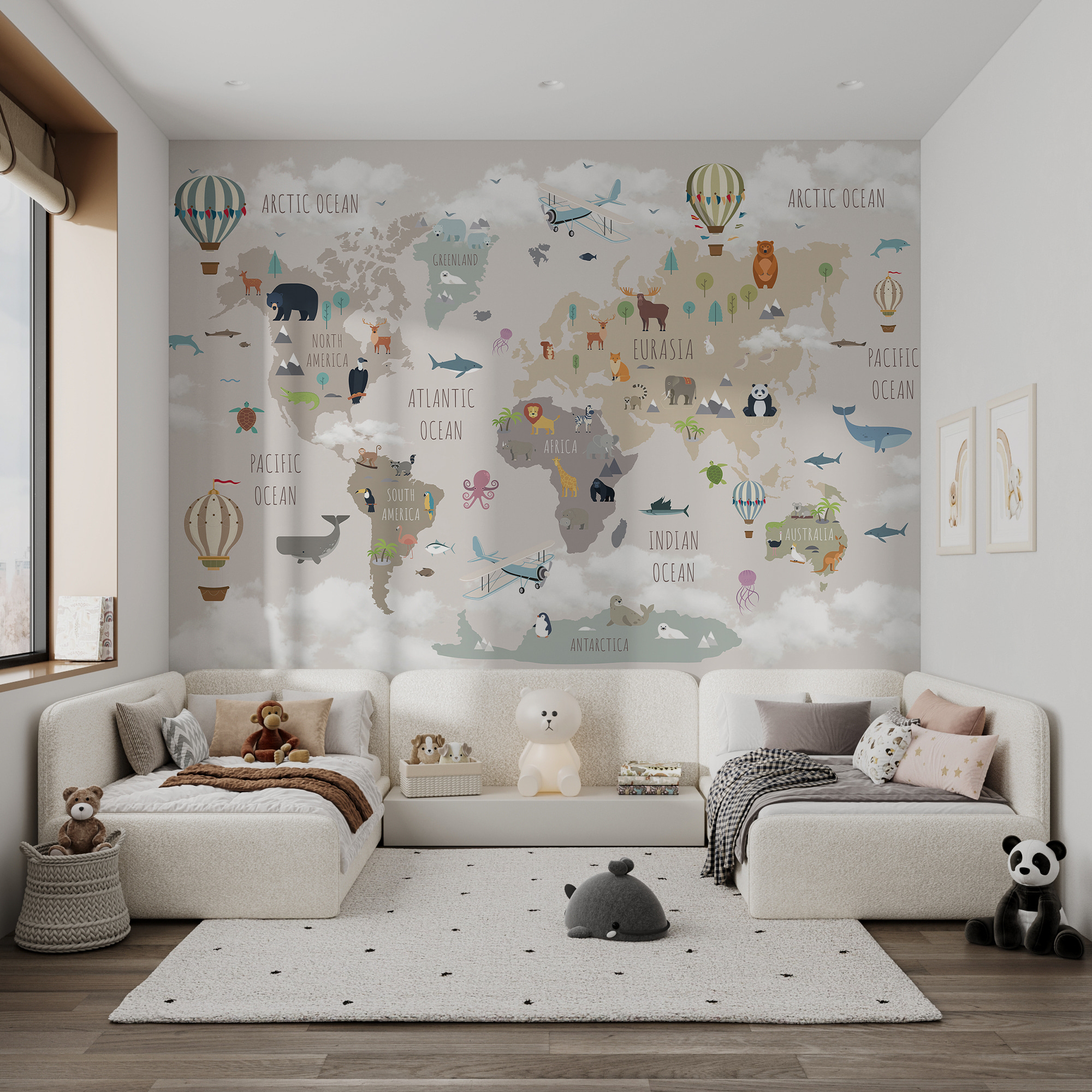 Táto nástenná maľba nie je len dekoráciou – je to celý zážitok. Deti sa môžu dozvedieť o rôznych kontinentoch a oceánoch a zároveň si všimnúť svoje obľúbené zvieratá, od ľadových medveďov v Grónsku až po klokany v Austrálii. Tlmené farby sú upokojujúce, ideálne na rozprávky pred spaním alebo lenivé nedeľné popoludnia. Je to druh dekoru, ktorý podnecuje predstavivosť a zvedavosť, takže sa skvele hodí do detských izieb, herní alebo dokonca tried. Navyše, každý deň si môžete všimnúť nové detaily, ktoré udržia kúzlo pri živote.