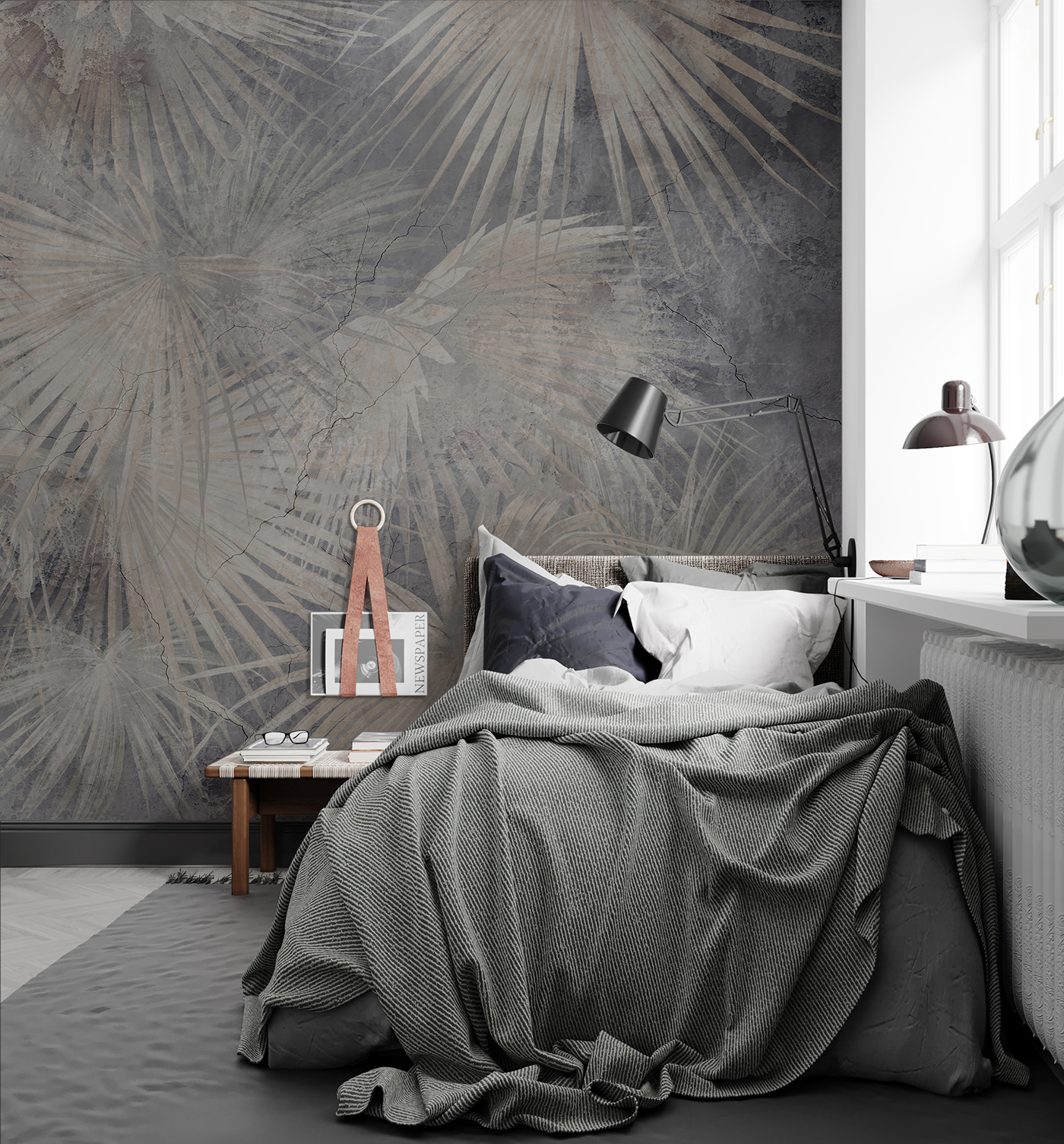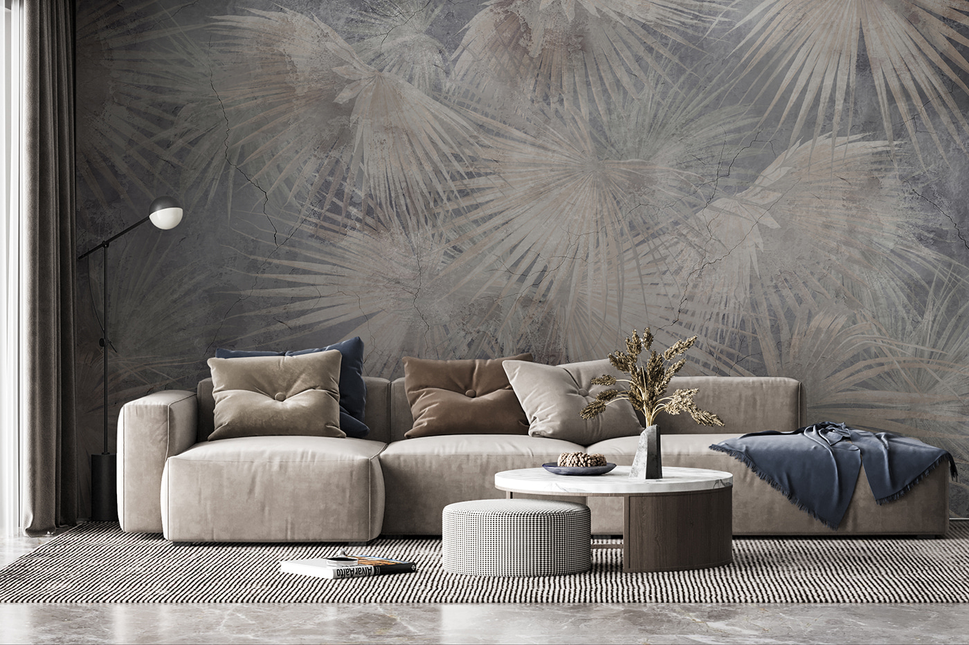 Predstavte si, že vojdete do svojej obývačky a budete mať pocit, že ste práve vstúpili do umeleckej galérie pod holým nebom, s palmovými listami jemne navrstvenými na nádherne popraskanom pozadí. Je to viac než len tapeta – akoby ste si priniesli kúsok modernej prírody priamo do svojho domova.