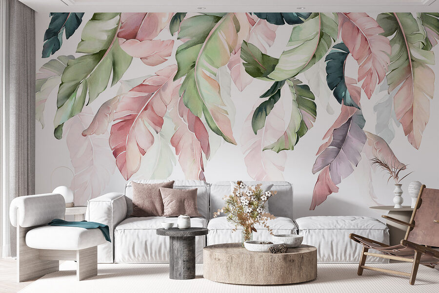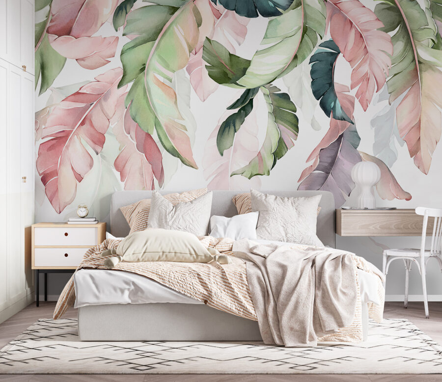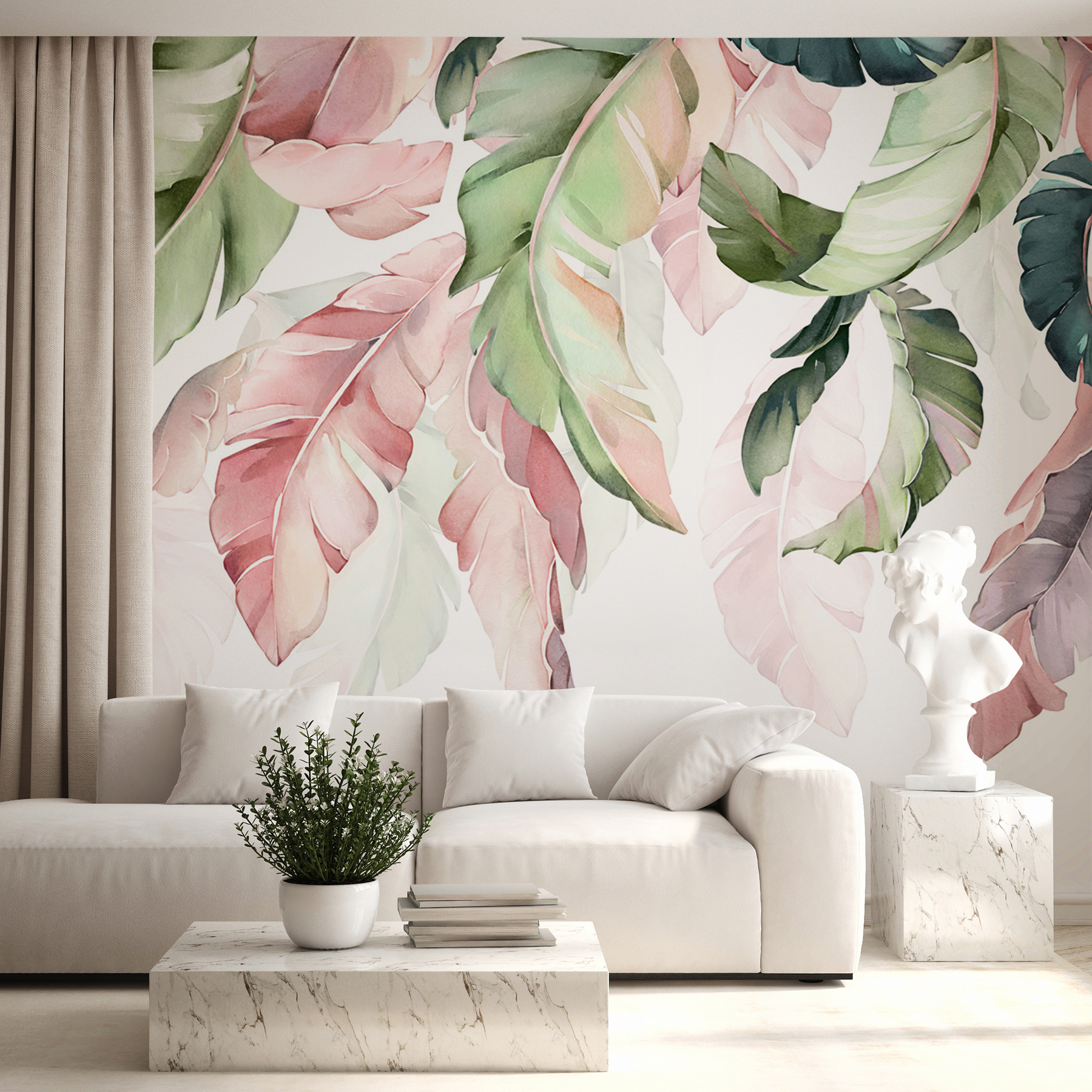 Premeňte akúkoľvek miestnosť na listnatý únik s touto úžasnou nástennou maľbou s farebnými listami tvoriacimi pôvabný baldachýn. Predstavte si, že vstúpite do svojho priestoru a budete mať pocit, akoby ste sa preniesli do pokojného lesa. Jemné odtiene zelenej, ružovej a mäkké vzory nielenže zdobia stenu – vyzývajú k hravej, ale zároveň upokojujúcej atmosfére, ktorá je ideálna na útulné večery alebo veselé rána. Či už ide o ústredný prvok obývacej izby alebo pozadie na domáce rozhovory, táto nástenná maľba dodáva nádych elegancie prírody bez potreby záhrady. Milovníci prírody určite ocenia túto atmosféru, nehovoriac o tom, že poslúži ako fantastický podnet na rozhovor. Nie je potrebný žiadny zelený palec!