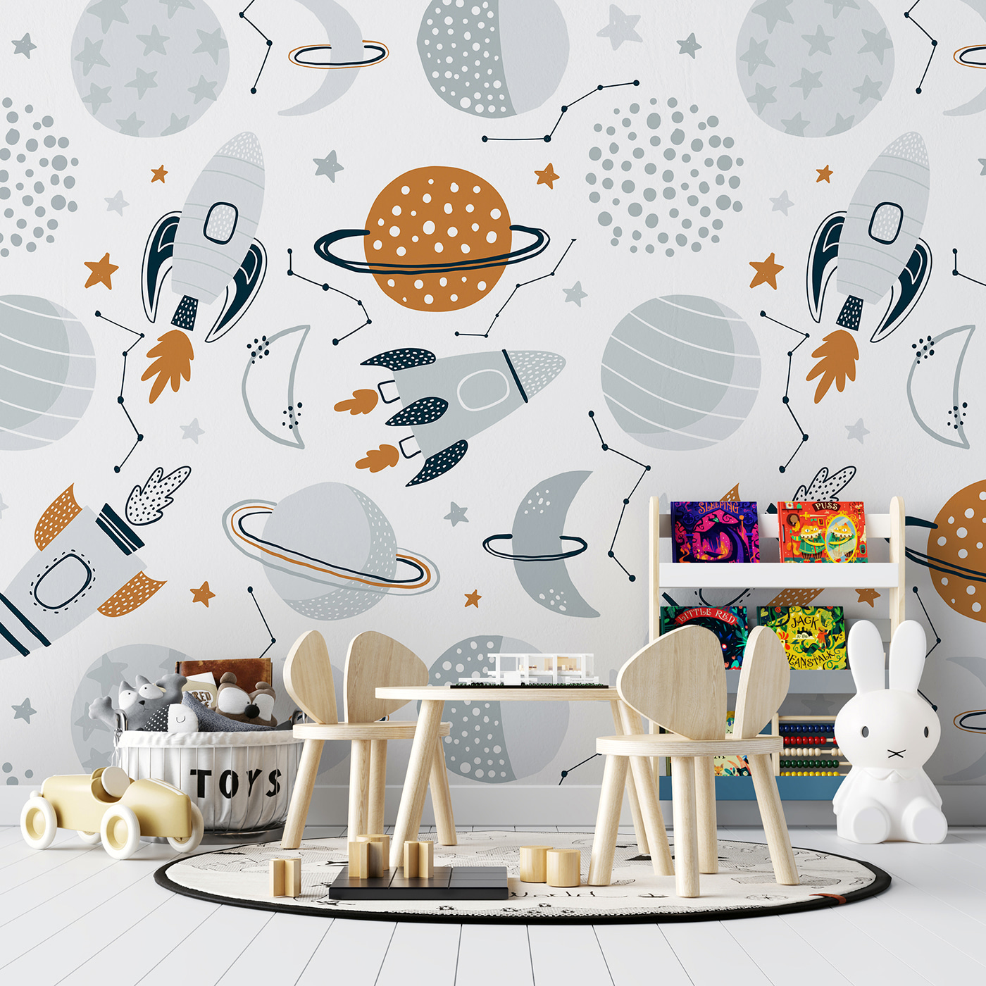 Predstavte si príbehy pred spaním, ktoré táto nástenná maľba podnecuje; v jednej chvíli pilotujú raketu, v ďalšej tancujú medzi hviezdami. Jemné farby ju upokojujú, zatiaľ čo detailné vzory ju udržiavajú vzrušujúcu. Táto nástenná maľba bez problémov spája učenie a zábavu, či už je určená do detskej izby alebo do herne, a mení obyčajný priestor na vesmírnu krajinu zázrakov.