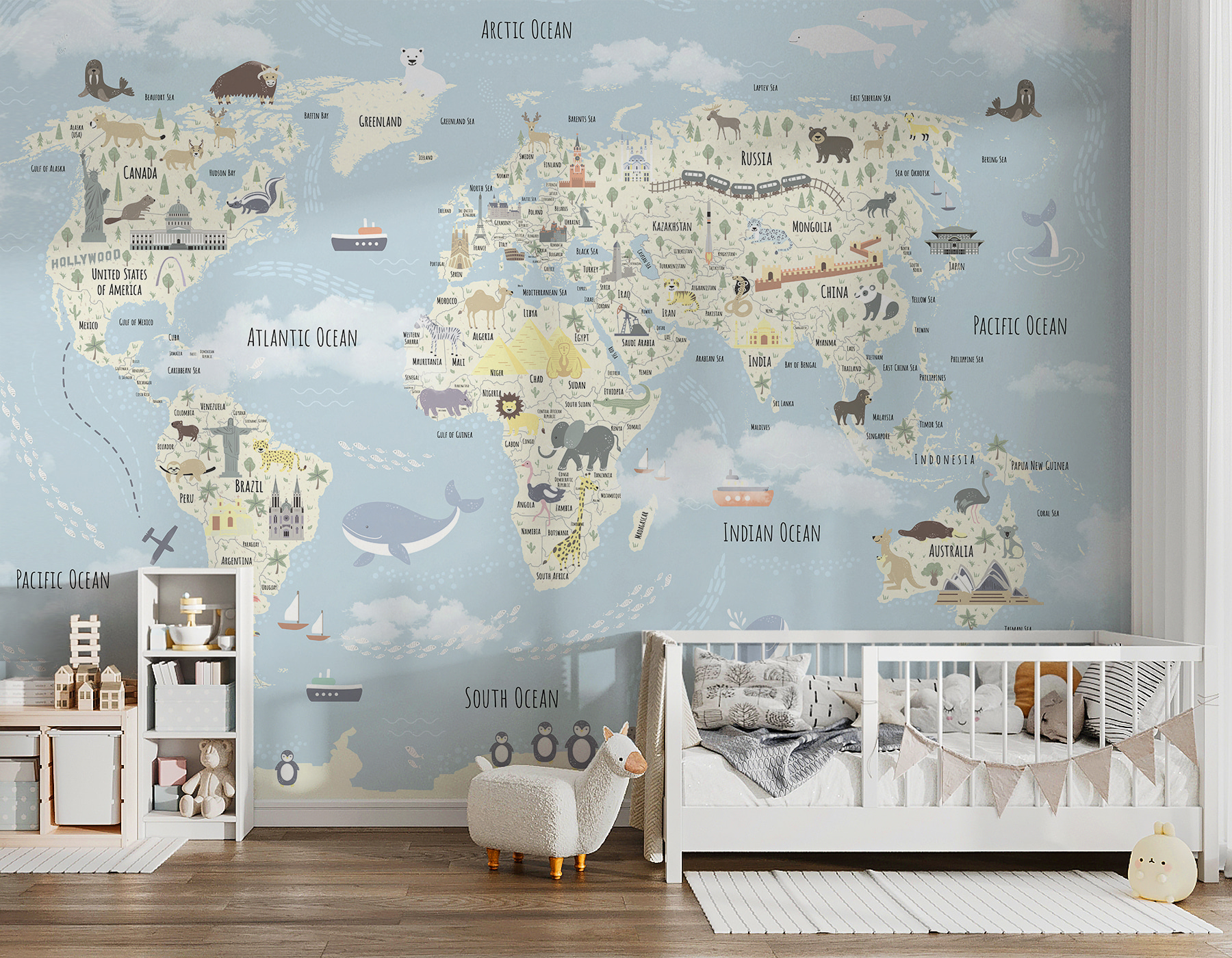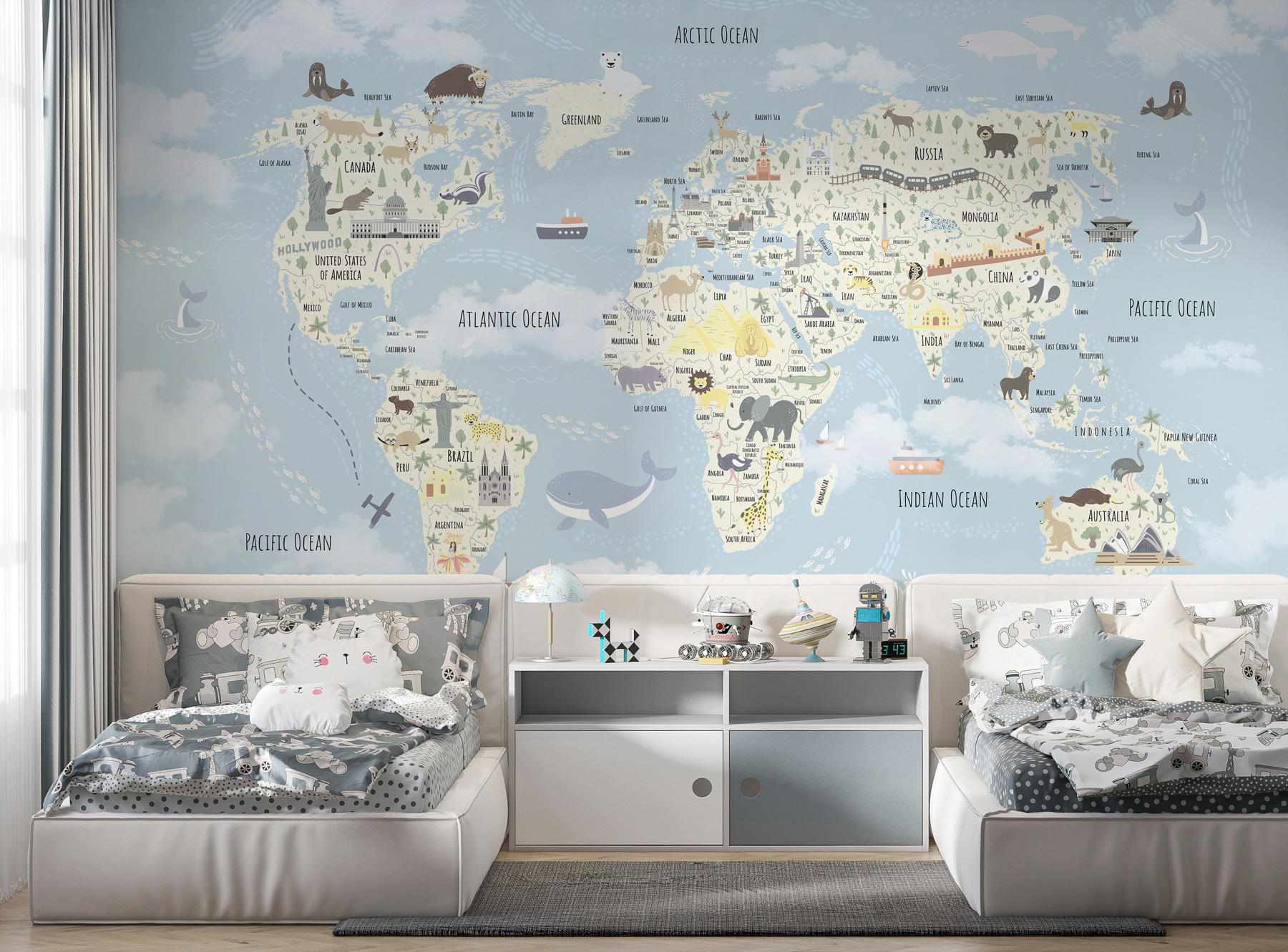 Predstavte si túto nástennú mapu sveta v detskej izbe – akoby ste im dali možnosť objavovať vesmír bez toho, aby ste museli opustiť domov. Zakaždým, keď sa na ňu pozrú, prenesú sa z Aljašky do Austrálie. Roztomilá a detailná maľba je plná zvierat, pamiatok a zaujímavých kúskov, ktoré podnecujú zvedavosť. Vďaka jemným pastelovým odtieňom je jemný pre oči a dodáva hravú, ale upokojujúcu atmosféru. Ideálna pre najmenších, či už sú to milovníci geografie alebo len snílkovia. Stačí ich sledovať, ako sa rozžiaria, keď zbadajú nové zviera alebo krajinu – cestujú po svete zo svojho útulného priestoru! Skvelé aj na rozprávanie príbehov – predstavte si dobrodružstvá, ktoré si budú predstavovať. Navyše je dostatočne pekný na to, aby sa stal samostatným umeleckým dielom! Aká je to zábava?