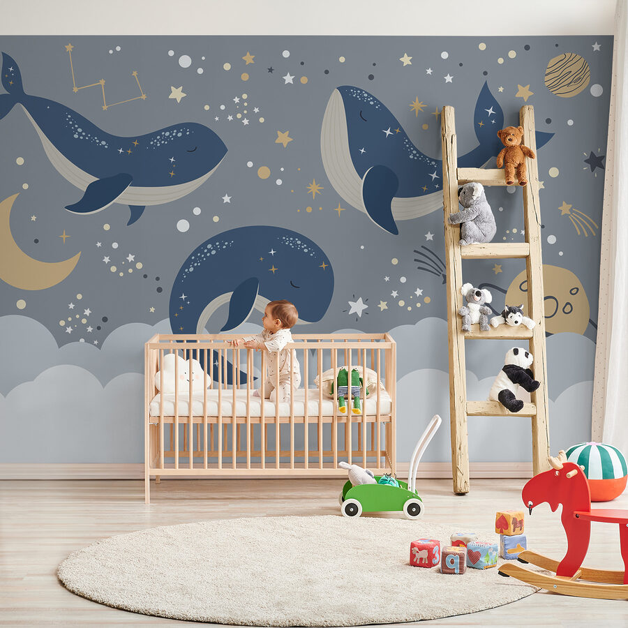 Chcete do detskej izby vniesť nádhernú atmosféru? Pozrite si túto snovú “Nástennú maľbu Modrá veľryba s bielym chvostom a hviezdami!” Predstavte si to na stene svojho dieťaťa – je to ako jeho vlastný kúsok nočnej oblohy s plyšovými modrými veľrybami, ktoré jemne plávajú v mori hviezd a súhvezdí. Perfektne sa hodí do detských izieb alebo do priestoru každého malého dobrodruha a dodá mu ten správny nádych kúzla a pokoja. Navyše sa zdá, že tieto ospalé veľryby sľubujú sladké sny pre každého, kto pod nimi zaspí. Je rozmarná, upokojujúca a trochu hravá – nádherná kulisa na rozprávky pred spaním a popoludňajší spánok. Či už je to pre vášho syna, dcéru alebo pre chvíle, keď sa s dieťaťom maznáte, premení každú stenu na upokojujúce dobrodružstvo plné hviezd.
