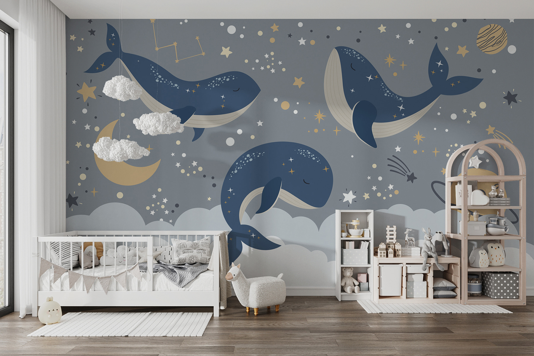 Chcete do detskej izby vniesť nádhernú atmosféru? Pozrite si túto snovú “Nástennú maľbu Modrá veľryba s bielym chvostom a hviezdami!” Predstavte si to na stene svojho dieťaťa – je to ako jeho vlastný kúsok nočnej oblohy s plyšovými modrými veľrybami, ktoré jemne plávajú v mori hviezd a súhvezdí. Perfektne sa hodí do detských izieb alebo do priestoru každého malého dobrodruha a dodá mu ten správny nádych kúzla a pokoja. Navyše sa zdá, že tieto ospalé veľryby sľubujú sladké sny pre každého, kto pod nimi zaspí. Je rozmarná, upokojujúca a trochu hravá – nádherná kulisa na rozprávky pred spaním a popoludňajší spánok. Či už je to pre vášho syna, dcéru alebo pre chvíle, keď sa s dieťaťom maznáte, premení každú stenu na upokojujúce dobrodružstvo plné hviezd.