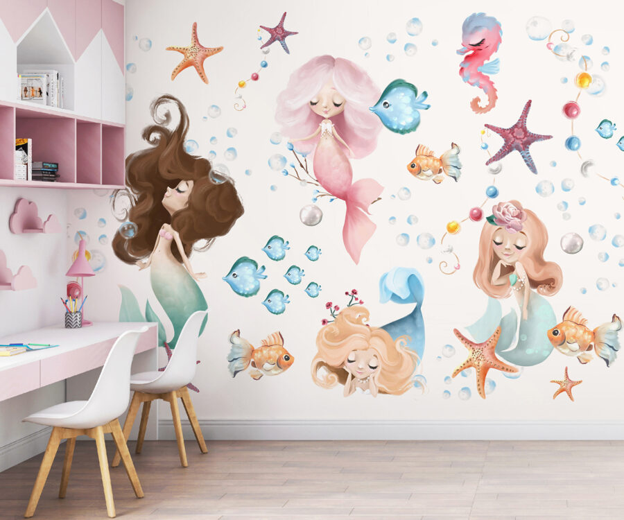 Predstavte si toto: nádherná nástenná maľba plná rozmarného šarmu. Kreslené dievčatko s krásnymi dlhými hnedými vlasmi sa pokojne vznáša medzi zasneným podmorským svetom. Jemné pastelové odtiene a hraví morskí kamaráti – predstavte si veselé rybky a pôvabné morské hviezdice – víria okolo v čarovnom tanci. Či už ide o izbu vášho dieťatka, alebo o priestor, ktorý potrebuje kúsok radosti, táto fototapeta premení obyčajné steny na očarujúcu rozprávkovú scénu. Je to ako priniesť kúsok krajiny fantázie priamo k vašim dverám – len sa pozrite, ako sa rozžiaria tie malé oči! 🌊✨