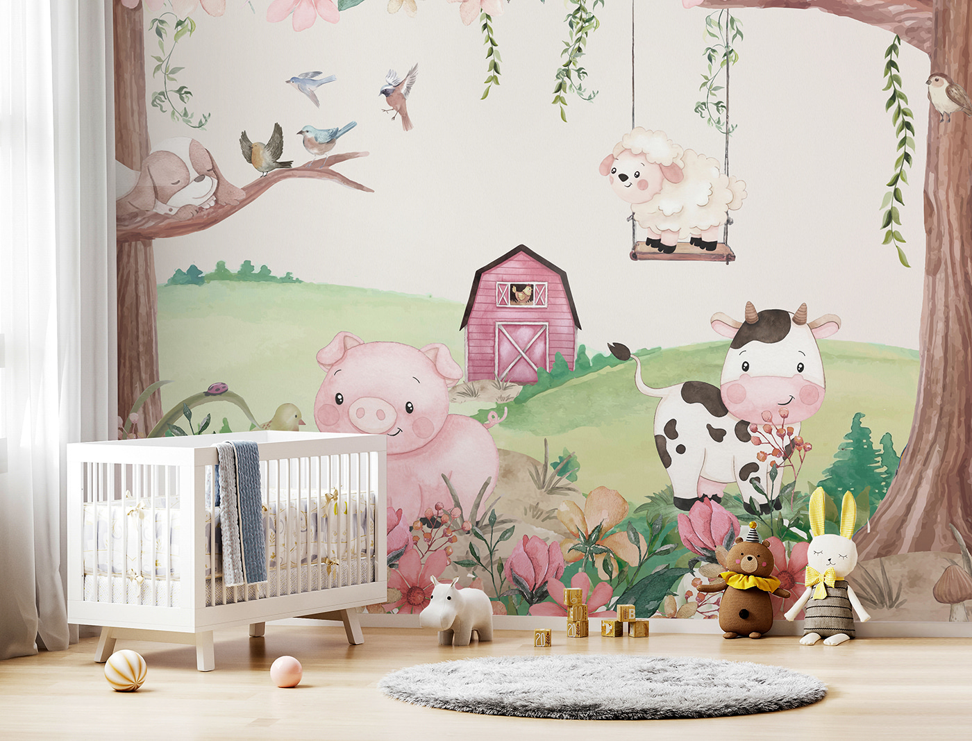 Vďaka jemným farbám a hravým ilustráciám je mimoriadne príťažlivá. Viete si s ním na stene predstaviť útulný čitateľský kútik alebo priestor na hranie? Je to ako dokonalá kulisa pre najrôznejšie dobrodružstvá – možno dokonca pre hravé bábkové divadlo so zvieratkami ako divákmi! A tie malé detaily, ako usmievavé prasiatko a veselá kravička, zaručene vyvolajú úsmev. Navyše je v tom niečo upokojujúce – jemná pripomienka jednoduchších čias a hravých dní.