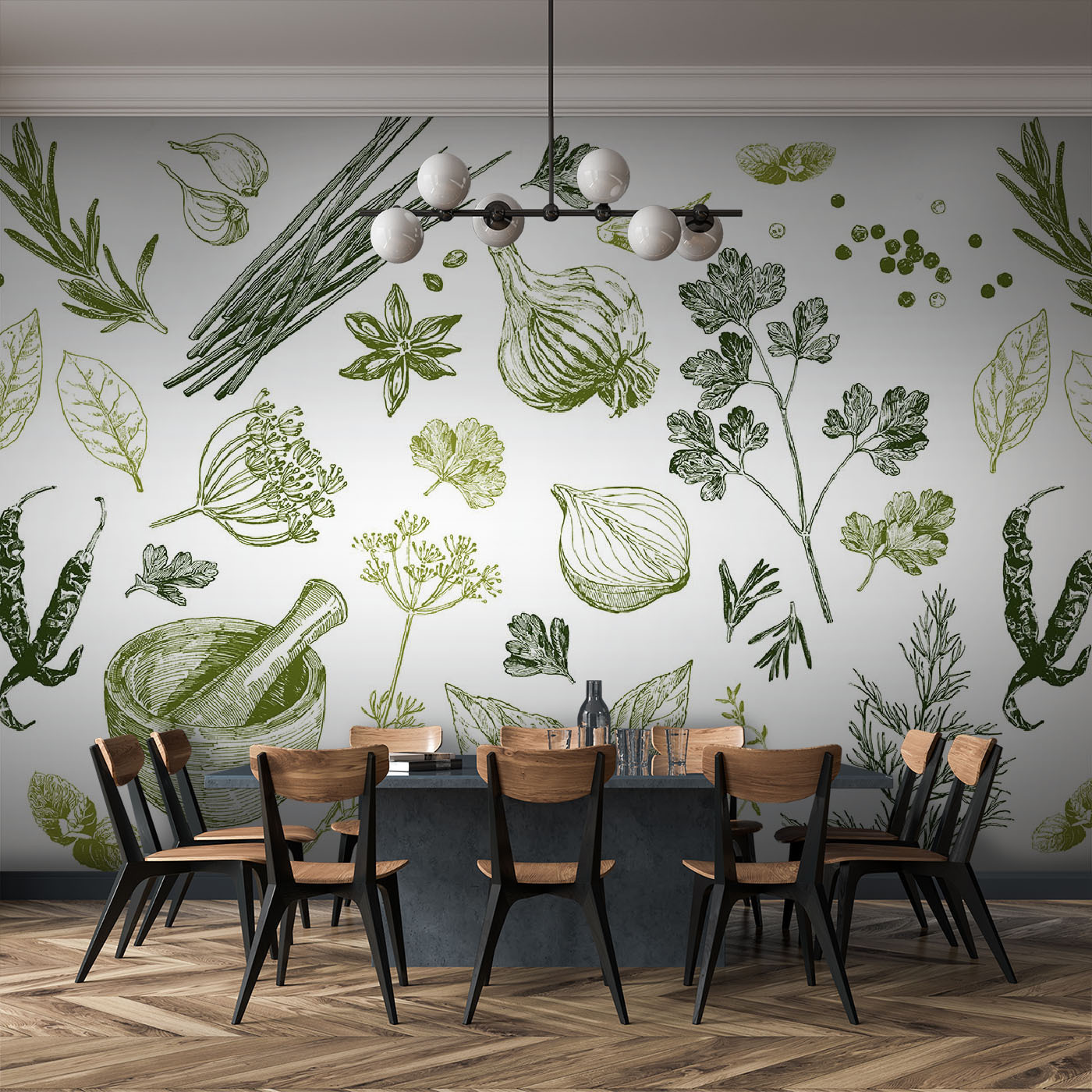 Premeňte akýkoľvek kulinársky priestor na voňavé útočisko pomocou tejto nádhernej nástennej maľby s pestrým sortimentom byliniek a korenín. Predstavte si žiarivé zelené a zemité tóny tancujúce po stenách, vďaka ktorým bude každé jedlo o niečo čarovnejšie. Akoby ste mali priamo v kuchyni minizáhradku, ktorá vás takmer láka na prípravu pesta alebo čerstvého šalátu. Navyše, kto by nemal rád rozhovory? Hostia sa budú pýtať na tieto jedinečné výtlačky. Zaveste ju do útulného kúta a sledujte, ako prináša teplo a inšpiráciu a mení čas varenia na čistú radosť. Okoreňte svoj interiér!