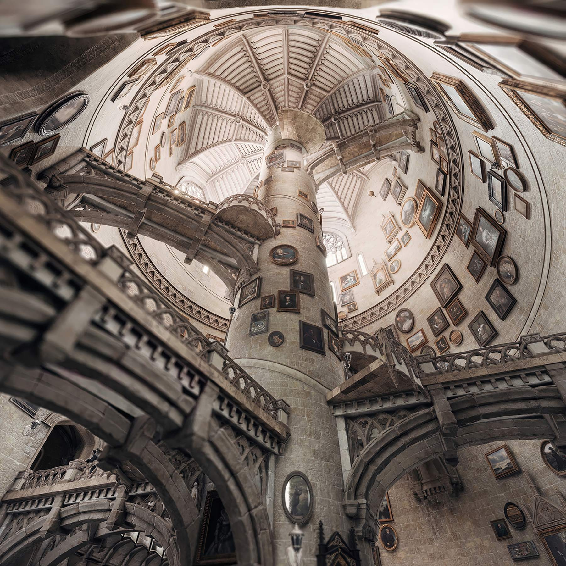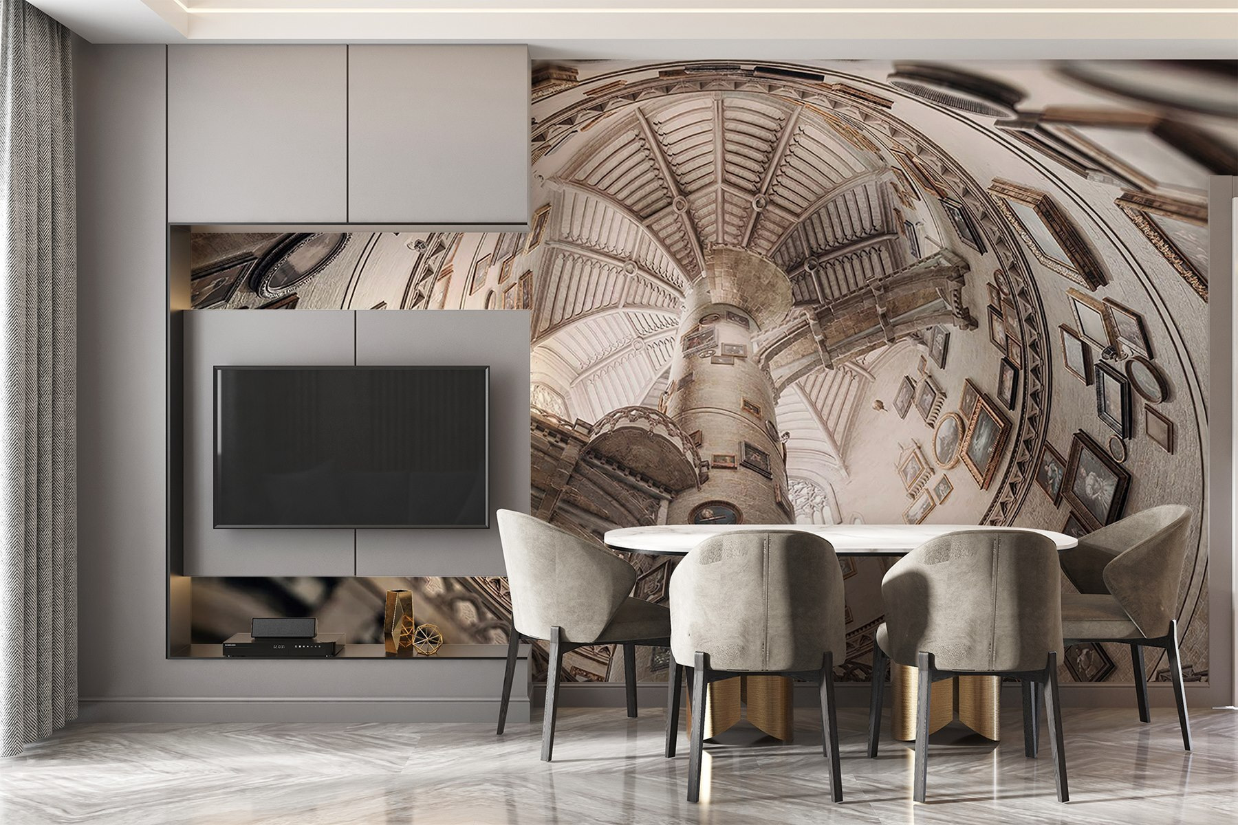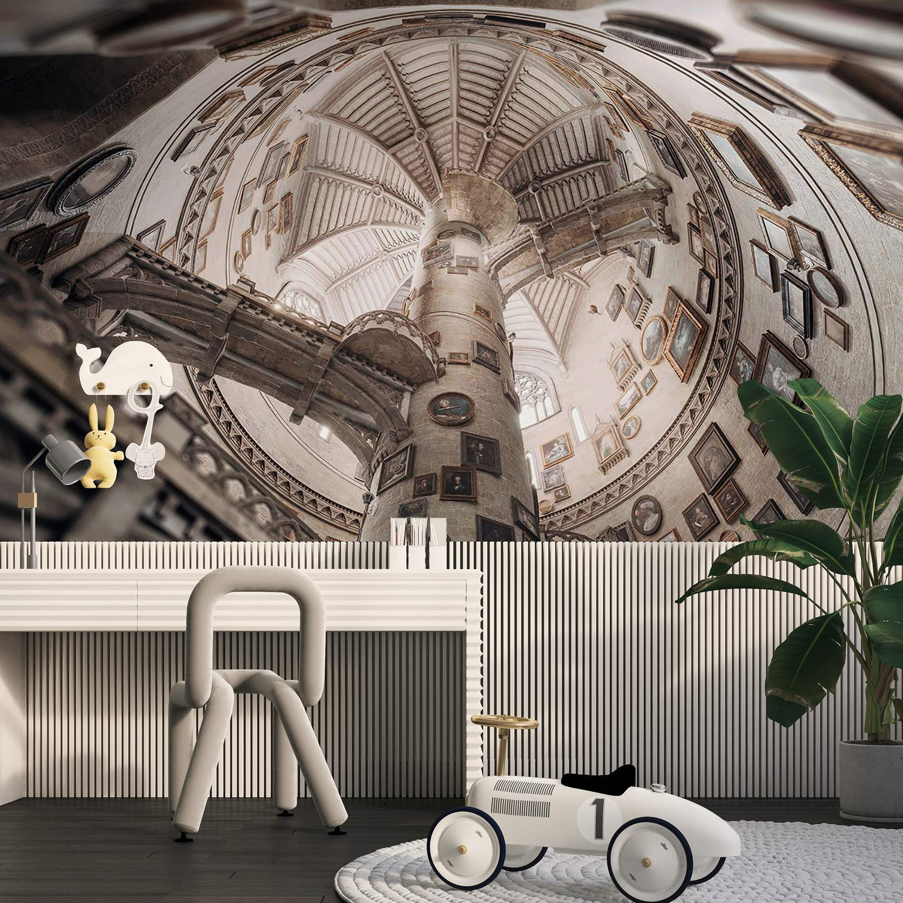 Vstúpte do rozmarného sveta s nástennou maľbou “Kruhová budova s viacerými schodiskami”. Predstavte si, že sa pozeráte hore a strácate sa v očarujúcej špirále, kde každé schodisko vedie k novým objavom. Pôvab historických portrétov na stenách dodáva nepredvídateľný nádych, vďaka ktorému sa budete cítiť ako pri vlastnom dobrodružstve na ceste v čase. Predstavte si, ako popíjate čaj s priateľmi, obklopení touto úžasnou kulisou – diskusie sa presúvajú od umenia k tomu čudnému videu s mačkou z minulého týždňa! Táto nástenná maľba nie je len dekoráciou, ale aj výzvou na rozvinutie fantázie a vytvorenie vlastných príbehov. Je ideálna na dotvorenie akejkoľvek miestnosti a rozhodne urobí z vašich stien hviezdu predstavenia!