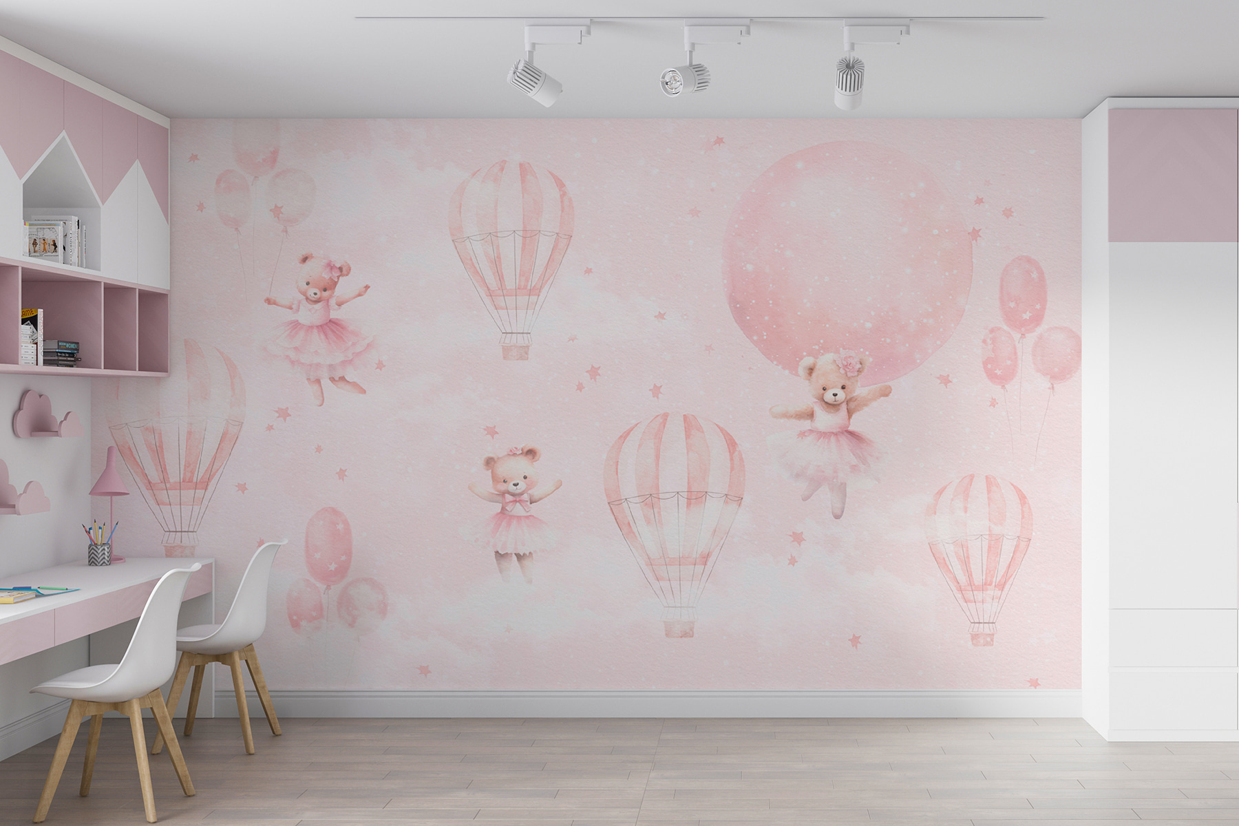 Pri každom vstupe do miestnosti sa cítite ako v hrejivom objatí mäkkého medvedíka. Jemné ružové odtiene a vznášajúce sa hviezdy vytvárajú upokojujúcu atmosféru – ideálnu na vytvorenie šťastných, zasnených priestorov. Nie je to len dekorácia, je to zážitok, ktorý si vaše dieťa bude vážiť. Priznajme si, že všetci potrebujeme v živote trochu rozmarnosti – prečo nezačať práve tu?