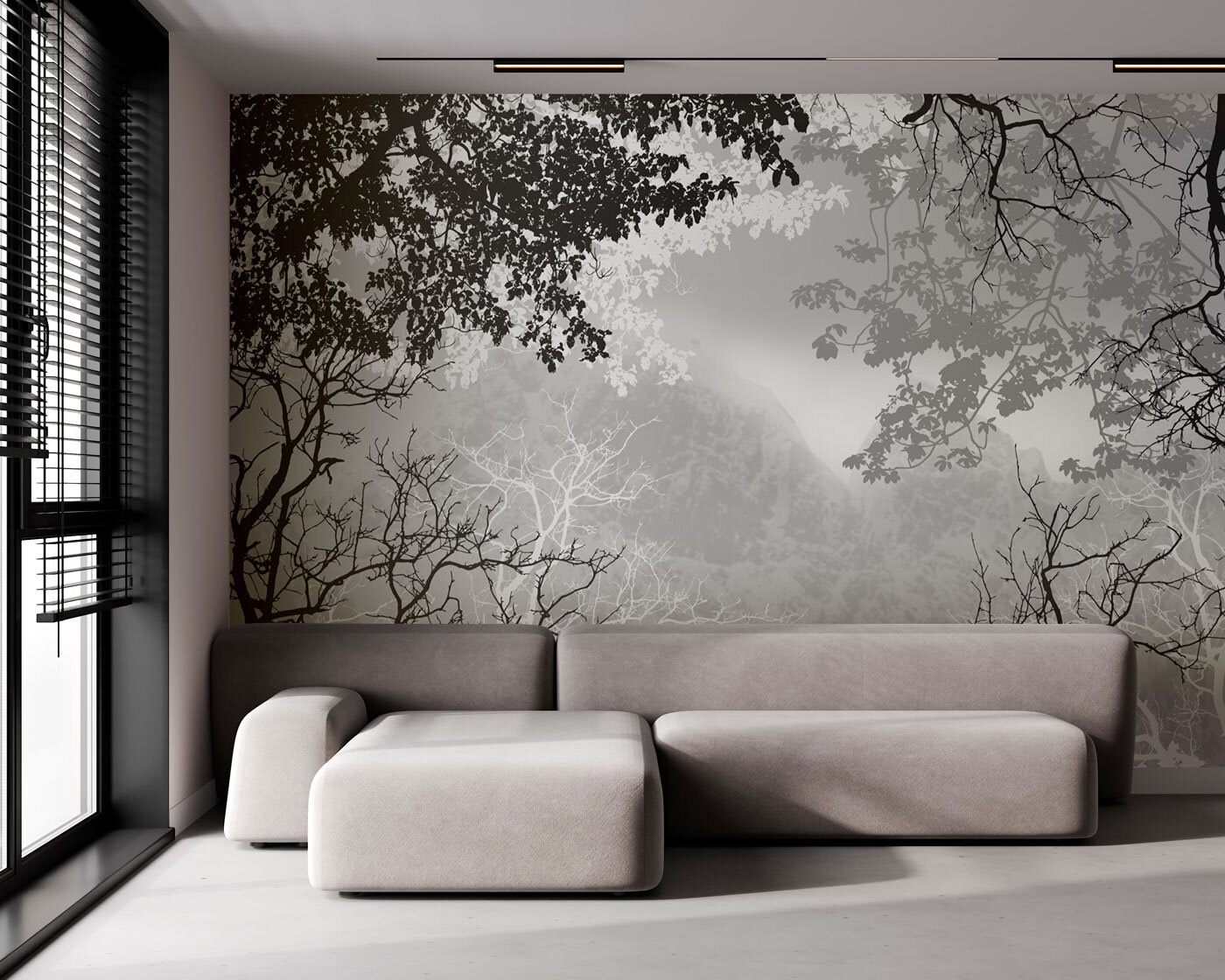 Predstavte si, že sedíte vo svojej obývačke so šálkou čaju v ruke a pozeráte sa na túto pokojnú fresku vetiev stromov s hmlistým horským pozadím. Je to ako preniesť pokojný kút hmlistého lesa priamo do vášho priestoru. Takmer očakávate, že budete počuť štebot vtákov a šumenie listov vetrom. Jedinečná kombinácia hôr a stromov na tejto nástennej maľbe vytvára upokojujúci a zároveň dramatický efekt – ideálny pre milovníkov prírody alebo pre každého, kto túži po dotyku divočiny. Navyše je v čiernej a bielej farbe, čo jej dodáva klasickú, nadčasovú atmosféru bez toho, aby narušila váš existujúci dekor. Či už pracujete doma, alebo len tak oddychujete počas lenivej nedele, táto nástenná maľba vás zahalí do objatia prírody – bez chrobákov.