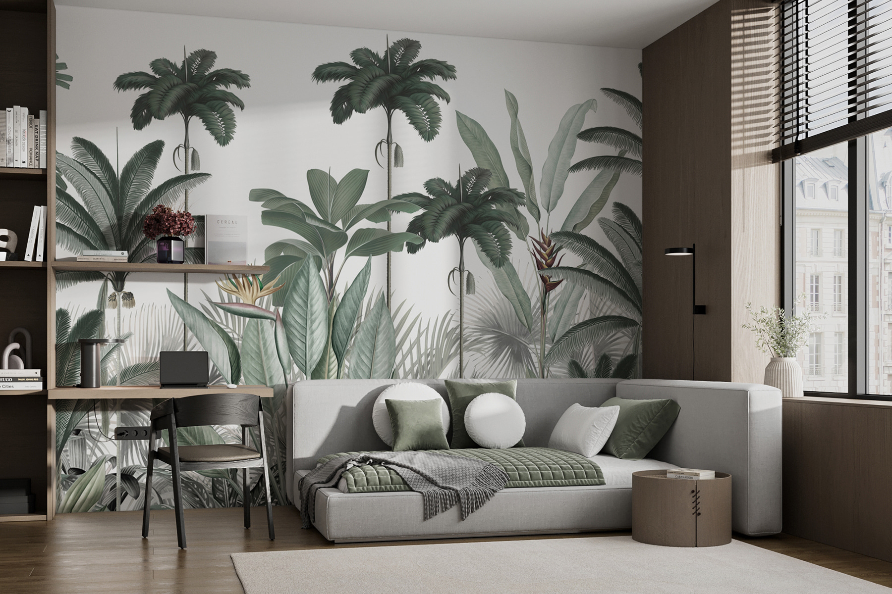 Predstavte si to: ležíte na pohovke so šálkou kávy, pozriete sa na stenu a uvidíte túto krásnu nástennú maľbu. Okamžite sa vám zdvihne nálada. Zeleň, textúra – akoby miestnosť mala svoj vlastný srdcový tep. Vaši hostia o nej neprestanú hovoriť a možno to bude práve ten malý únik, ktorý potrebujete po dlhom dni. Či už je to vo vašej obývačke, kancelárii alebo dokonca v spálni, táto nástenná maľba nie je len dekoráciou, je to zážitok.