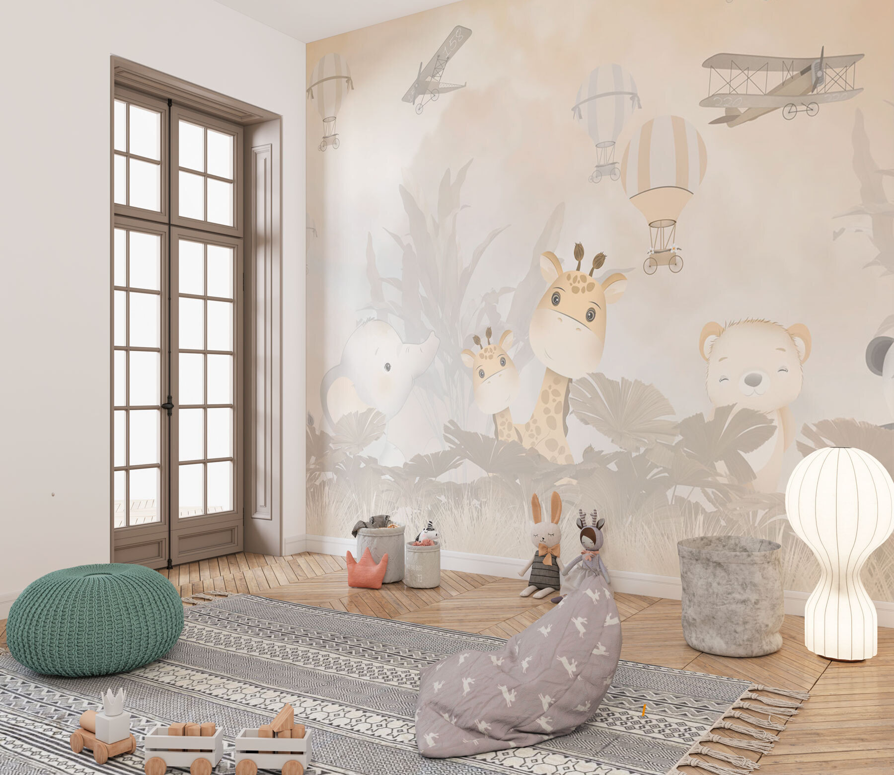 Táto nástenná maľba je ideálna pre synov aj dcéry a prináša pocit dobrodružstva a zázraku. Jemné, tlmené tóny z nej robia pokojný doplnok bez toho, aby zahltila miestnosť. Predstavte si svoje dieťa, ako sa so zvedavosťou pozerá nahor a možno rozpráva príbehy o eskapádach vo výškach alebo o jemných prechádzkach slonov pod oblohou plnou balónov.