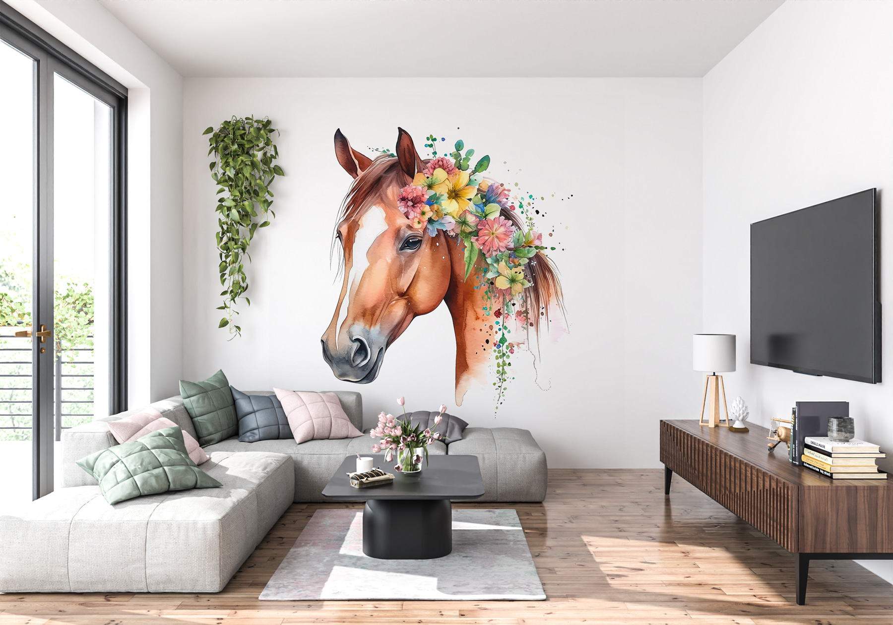 Predstavte si, že vojdete do miestnosti a privíta vás majestátny kôň vyzdobený živými kvetmi. Presne to robí táto fototapeta – premení obyčajnú stenu na nádherné prekvapenie! Je ideálna pre milovníkov zvierat, deti alebo kohokoľvek, kto chce svojmu priestoru dodať nádych rozmarnosti. Farby sú také živé, že prakticky vyskakujú priamo zo steny. Predstavte si radosť vášho dieťatka alebo úsmevy vašich hostí pri pohľade na tohto úžasného žrebca.