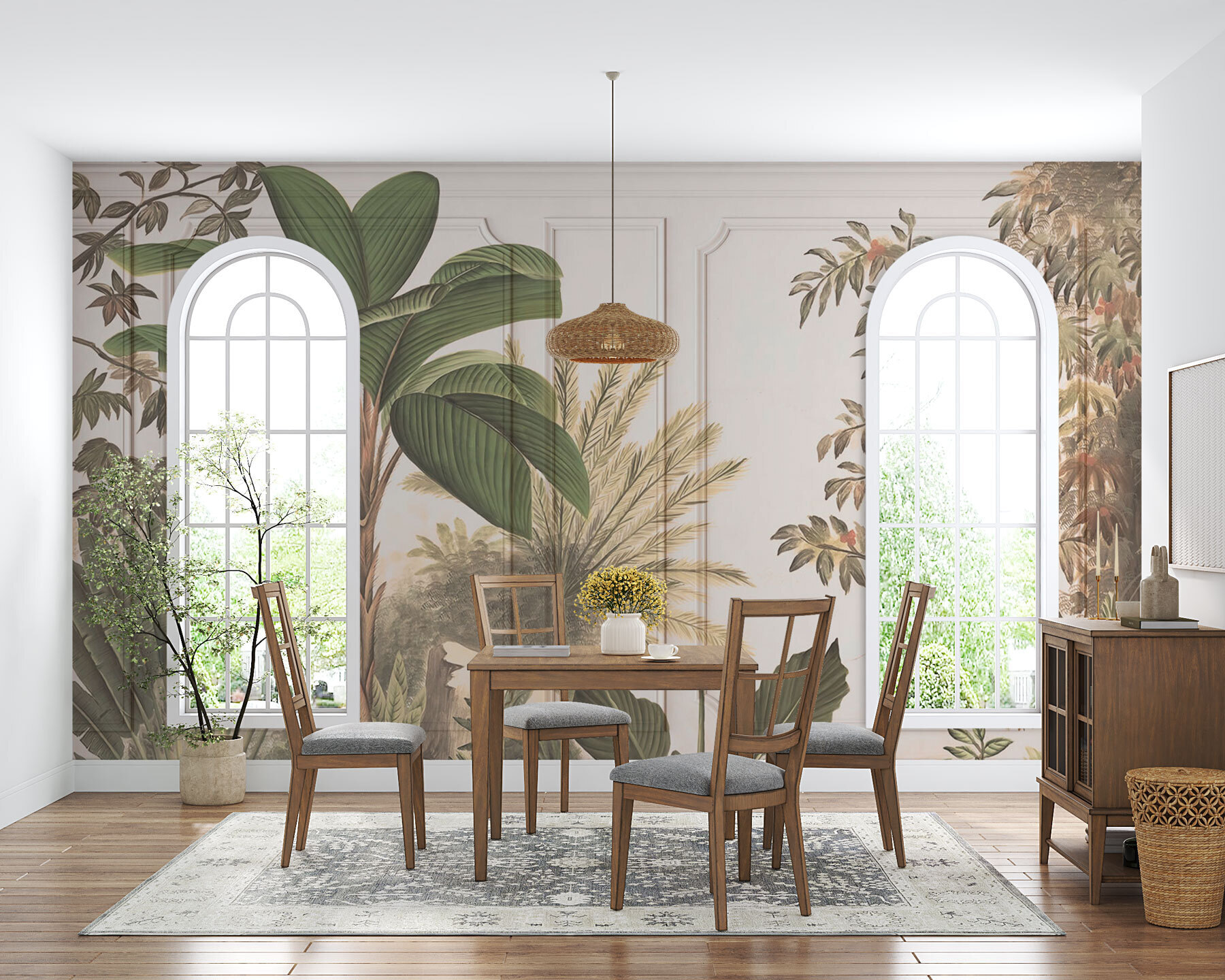 Predstavte si, že vojdete do svojej izby a BUM! na stene máte tento svieži výjav z džungle. Táto nástenná maľba je ako vstúpiť do exotickej krajiny priamo z vašej obývačky. Predstavte si zelené lístie a stromy, ktoré sa hojdajú v neviditeľnom vánku. Má tú tropickú atmosféru, vďaka ktorej bude váš priestor pôsobiť sviežo a živo.
