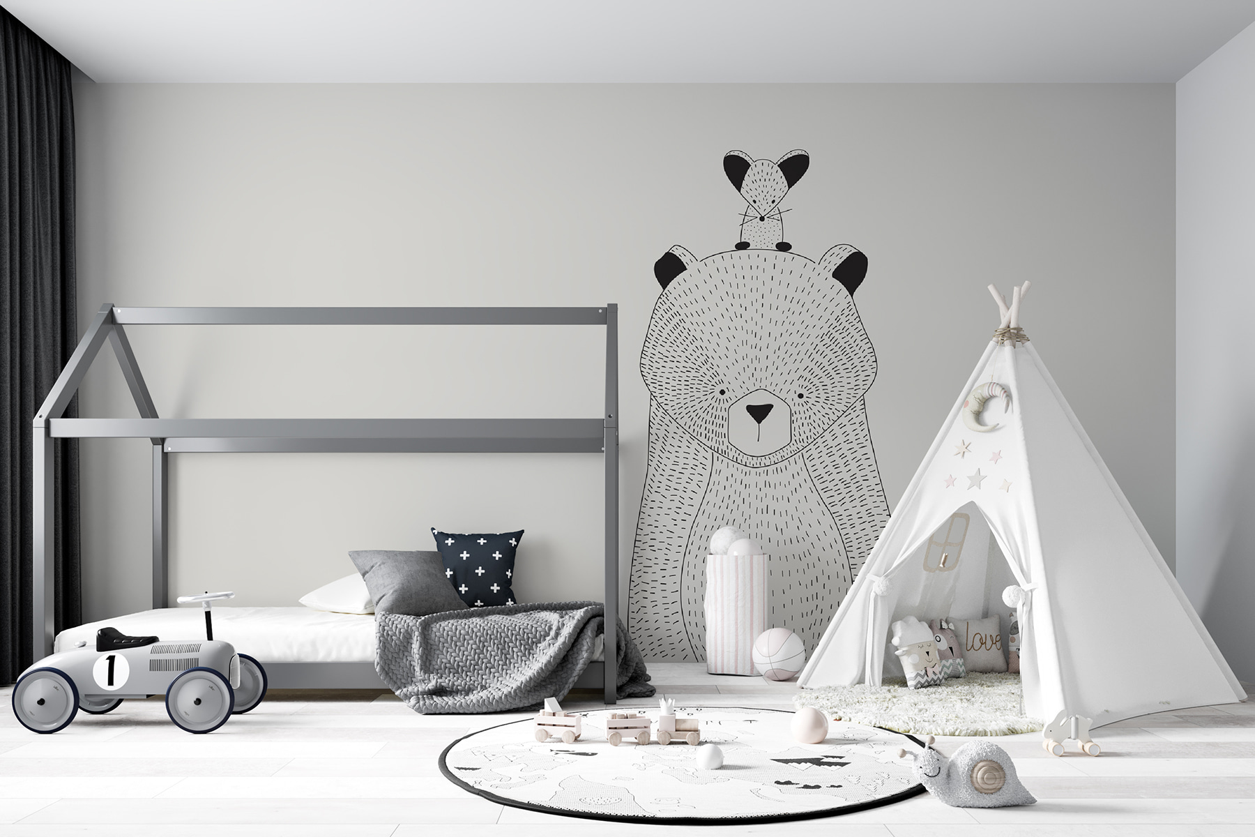 Pozrite si túto očarujúcu nástennú maľbu rozmarného medveďa, ktorá je ideálna na to, aby vniesla do detskej izby nádych útulnosti a hravosti! Predstavte si to nadšené chichotanie, keď vaše dieťatko hneď ráno zbadá tohto priateľského medveďa. Je to ako mať lesného kamaráta priamo v detskej izbe alebo herni.