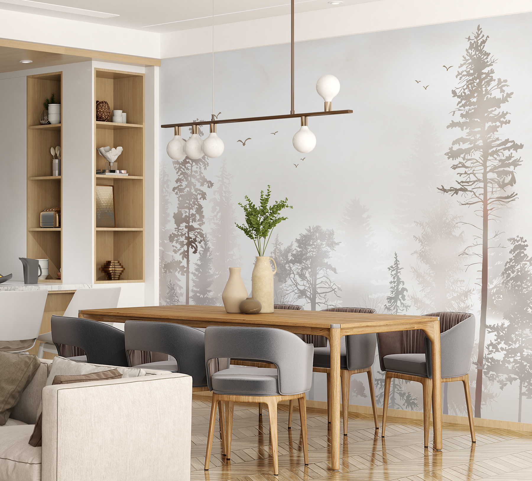 Chcete zmeniť nudnú stenu? “Shadow of a Tree” je nástenná maľba, ktorá vnesie upokojujúcu atmosféru hmlistého lesa priamo do vášho domova. Predstavte si, že popíjate rannú kávu s výhľadom na pokojné stromy zatienené mäkkým, hmlistým svetlom. Je to ako vstúpiť do rozprávkového lesa – bez toho, aby ste opustili svoju obývačku. Táto nástenná maľba sa hodí práve do útulných čitateľských kútikov, moderných obývacích izieb alebo dokonca do vynovených kancelárskych priestorov. Je to dokonalé spojenie prírody a umenia a úprimne, komu by sa nehodilo trochu pokojného lesa v jeho dni?