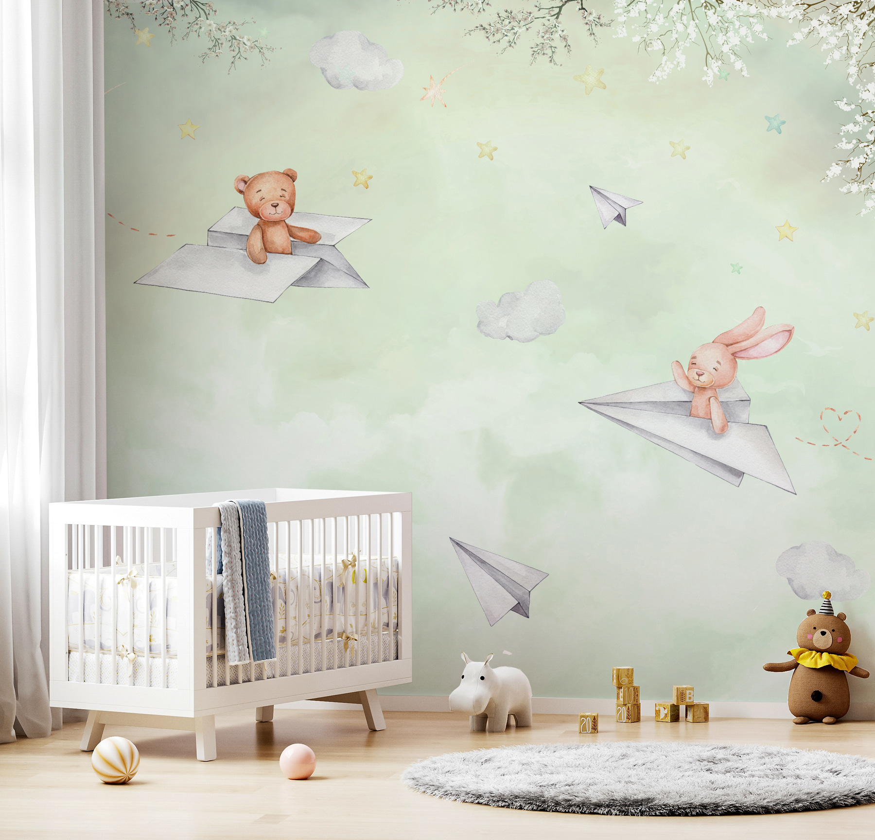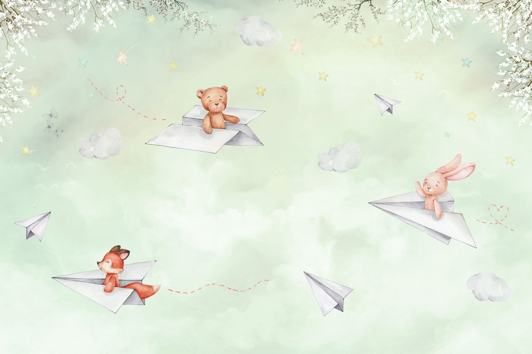 Premeňte priestor na zasnený únik pomocou tejto očarujúcej nástennej maľby. Predstavte si svet, v ktorom sa rozkošné zvieratká vznášajú v oblakoch na papierových lietadlách a naháňajú sa za sladkým šepotom snov. Tento dizajn prináša nádych rozmarnosti, ktorý si deti (a dospelí, buďme úprimní) zamilujú. Predstavte si, ako dieťatko ukazuje na veselého medveďa alebo hravú líšku a chichoce sa, keď sledujú dráhy týchto vznášajúcich sa lietadiel. Je to ako priateľské dobrodružstvo priamo v ich izbe. Jemné farby vytvárajú pokojnú atmosféru, ktorá je ideálna na rozprávky pred spaním. Dodajte každej stene hravé oživenie a sledujte, ako sa fantázia rozletí!