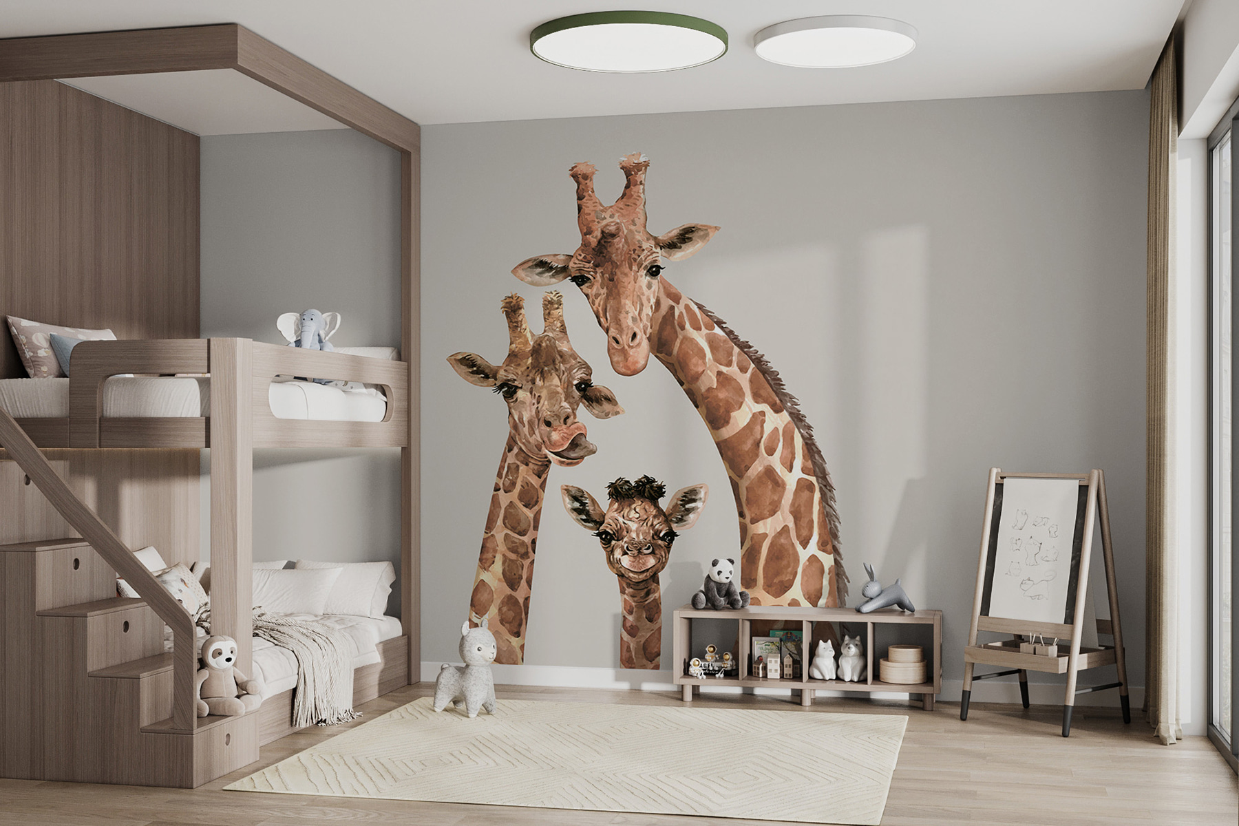 Tu je trochu zábavy a rozmarov pre vaše steny – naše “Nástenné maľby Skupina žiráf so spojenými hlavami” dodajú každej miestnosti šmrnc osobnosti. Len sa pozrite na tie rozkošné, zvedavé tváre! Či už zariaďujete detskú izbu, alebo len máte radi trochu hravého dekoru, tieto žirafy vám určite vyčaria úsmev na tvári zakaždým, keď ich uvidíte.