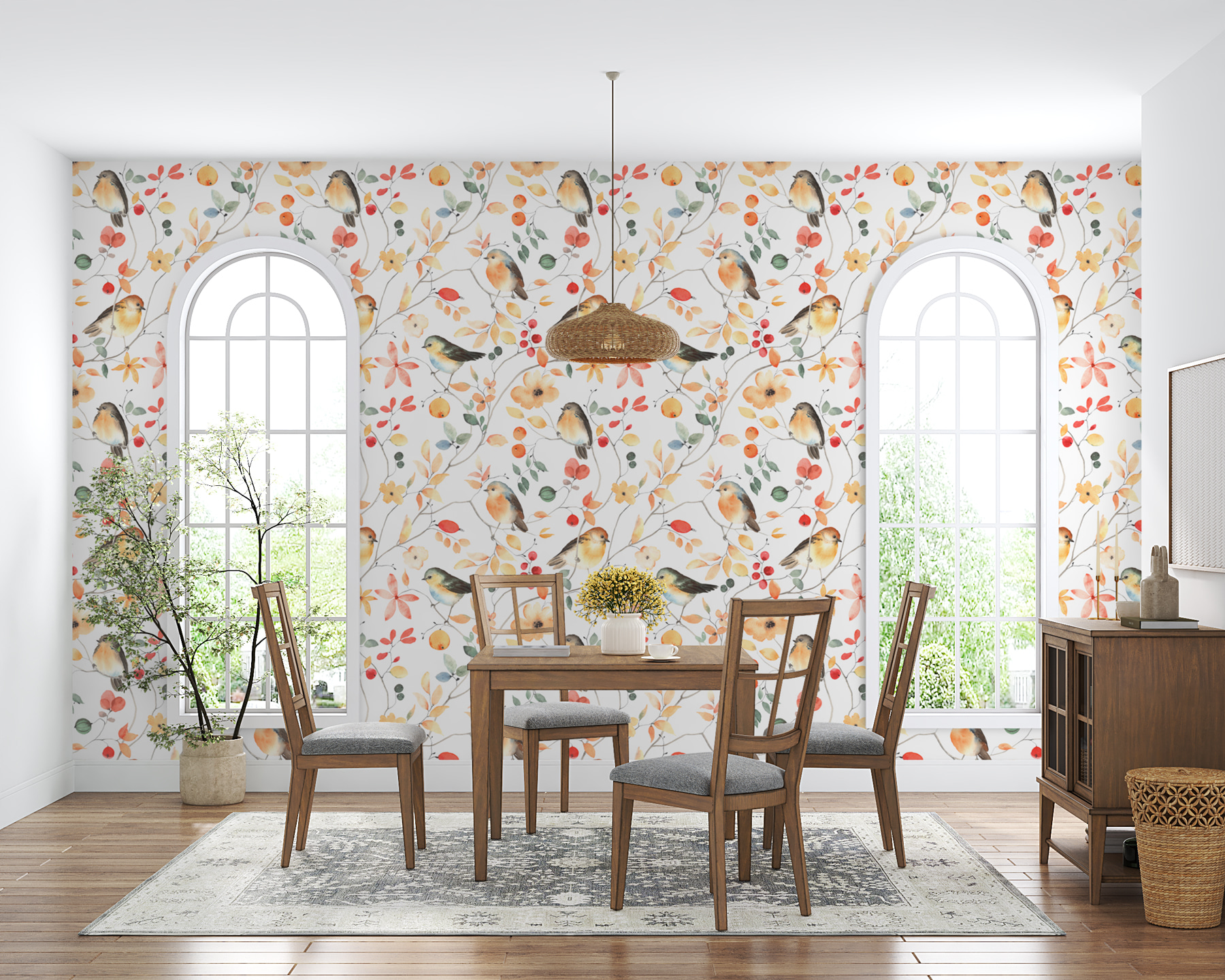 Predstavte si, že vaše steny ožijú touto nástennou maľbou “Vták na konári”! Nie je to len výtlačok, je to ako mať vo svojom priestore osobný kúsok prírody. Predstavte si to: jemné vtáky sediace na konároch, obklopené symfóniou farebných kvetov a lístia. Perfektne sa hodí na dodanie nádychu rozmarnosti a tepla do akejkoľvek miestnosti, či už je to spálňa, útulný čitateľský kútik, alebo dokonca vaša chodba. Vďaka jemným, príťažlivým farbám sa ľahko hodí k rôznym dekoráciám.