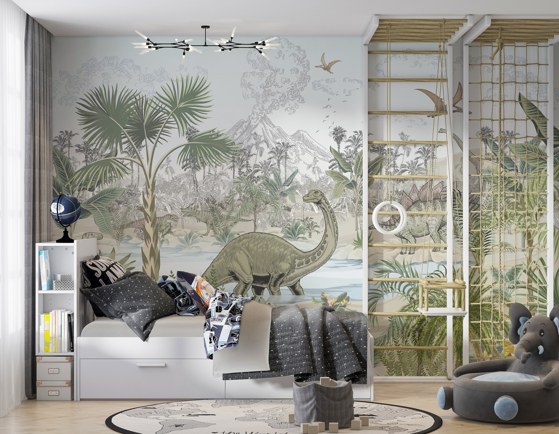 Premeňte detský priestor na prehistorický raj s touto živou nástennou maľbou s majestátnymi dinosaurami, ktoré sa potulujú po svojom sviežom tropickom domove. Predstavte si to vzrušenie, keď sa deti pozerajú na týchto nežných obrov a skúmajú ich fantastický svet. Táto nástenná maľba s hojdajúcimi sa palmami a dymiacou sopkou v pozadí podnecuje predstavivosť a dobrodružstvá, ktoré presahujú rozprávky pred spaním.