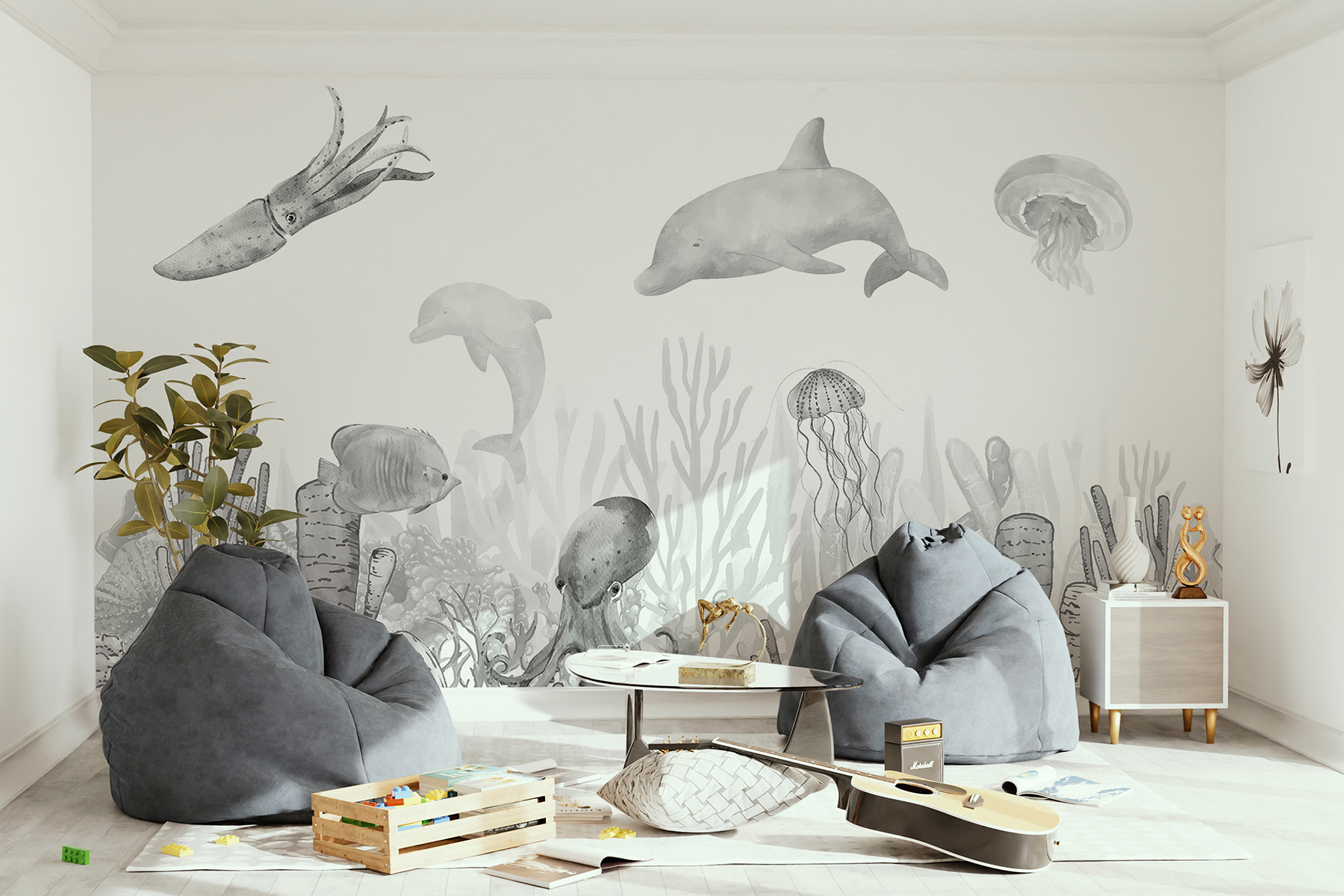 Predstavte si, že táto fototapeta rozžiari detskú izbu alebo váš vlastný kreatívny priestor – je to ako mať v interiéri kúzlo oceánu. Rozmarný akvarel chobotnice, okrem iných morských tvorov, pôsobí živo a hravo. Predstavte si to: zmes podmorského dobrodružstva a umeleckého šarmu. Či už ste tínedžer snívajúci o oceáne, batoľa fascinované morským životom, alebo dospelý, ktorý potrebuje pokojný únik, táto nástenná maľba vás zahalí do jemnej, nápaditej morskej krajiny. Nie je to len obyčajné nástenné umenie, je to brána k zázrakom hlbokého modrého mora priamo vo vašom útulnom kútiku!