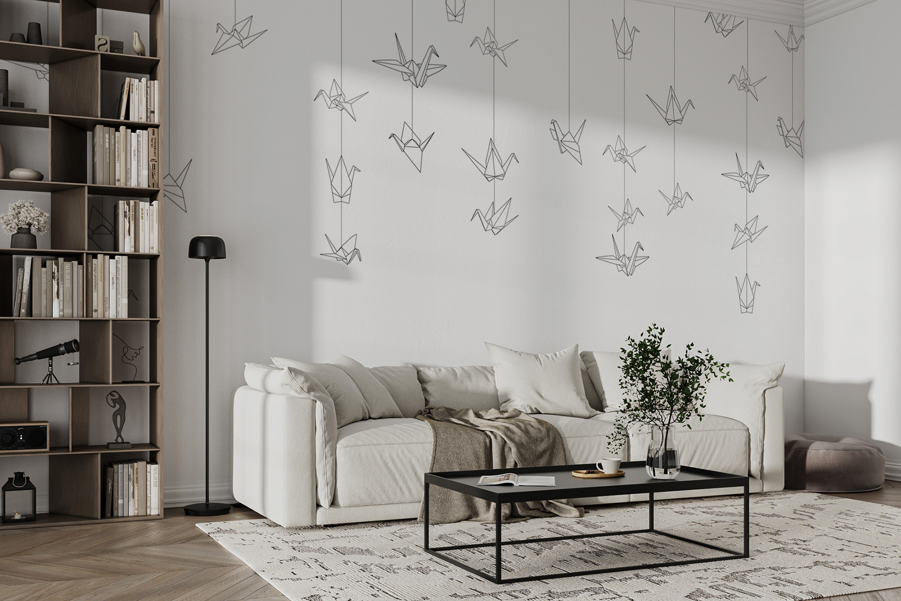 Premýšľali ste niekedy o tom, že by ste s minimálnym úsilím vniesli na svoje steny trochu umeleckého štýlu? Pozrite si túto čiernobielu nástennú maľbu vtákov. Je to ako mať kúsok svojho obľúbeného skicára zväčšený do životnej veľkosti. Jednoduché línie jej dodávajú takú elegantnú a modernú atmosféru. Predstavte si ju vo svojej obývačke alebo na pracovisku – takýto kúsok vás prinúti na chvíľu sa nadýchnuť a relaxovať. Navyše, na tých jemne visiacich papierových žeriavoch je niečo mimoriadne upokojujúce, takmer akoby boli v lete. Je to dokonalá kombinácia umenia a zenu. Ak si potrpíte na jedinečné dekorácie, ktoré vyvolávajú radosť (áno, moment Marie Kondo), táto nástenná maľba vás určite osloví.