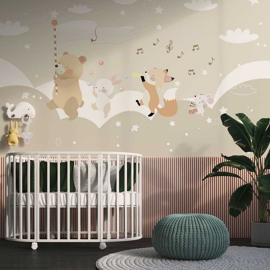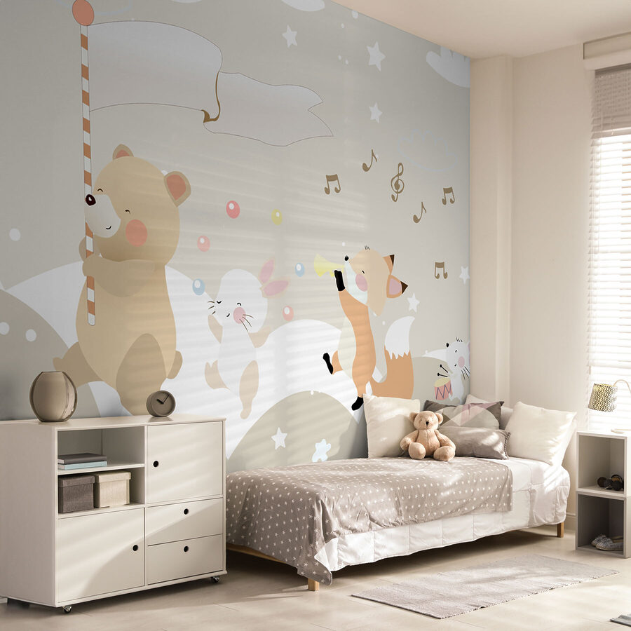 Premeňte detskú izbu na rozmarnú krajinu zázrakov s touto rozkošnou nástennou maľbou s veselým medvedíkom a jeho veselou partiou lesných kamarátov. Predstavte si, ako sa deti budia do hravej scény, v ktorej medvedík máva cukrovou trstinou ako vlajkou a pozýva do snov plných sladkostí a zábavy. Vedľa tancuje líška a poskakuje zajačik; je to ako malá paráda priamo na stene! Jemné farby a radostné výrazy vytvárajú upokojujúcu atmosféru, podnecujú predstavivosť a smiech. Ideálny do detských izieb alebo detských izieb, je to druh dekorácie, ktorá mení každodenné okamihy na dobrodružstvo – kto vie, aké príbehy sa tu odohrajú? Jednoduchý dotyk, ktorý má veľký vplyv!