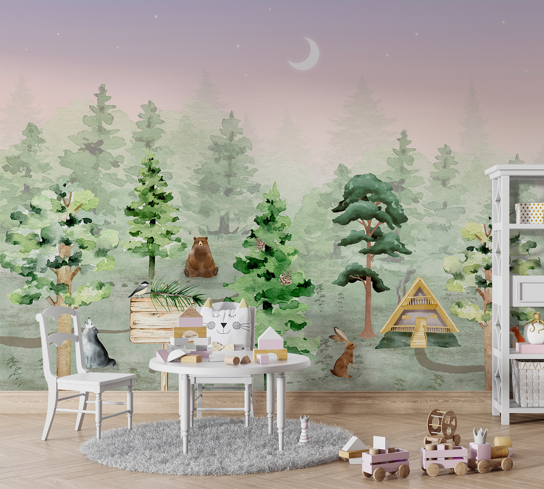 Predstavte si čarovný les priamo u vás doma – táto krásna fototapeta obsahuje roztomilého vtáčika sediaceho na drevenej tabuli, ktorý vás pozýva do rozmarnej lesnej scény. Okolo sa zhromažďujú zvierací priatelia, z ktorých každý dodáva kúsok šarmu a dobrodružstva. Ideálna do detských izieb, akoby ste každý deň vstúpili do obľúbenej rozprávkovej knihy. Vďaka jemným, upokojujúcim farbám pôsobia zvieratká ako priateľskí spoločníci. Deti si zamilujú spoznávanie líšky, zajaca a starého múdreho medveďa, keď sa budú ukladať na spánok. Mesačné svetlo dodáva kúzelný nádych a robí čas spánku ešte čarovnejším. Nie je to len nástenná maľba, je to cesta do zasneného lesa, ktorá v malých srdciach podnecuje predstavivosť a lásku k prírode. Kto by nechcel mať na stene tento malý zázračný kúsok?