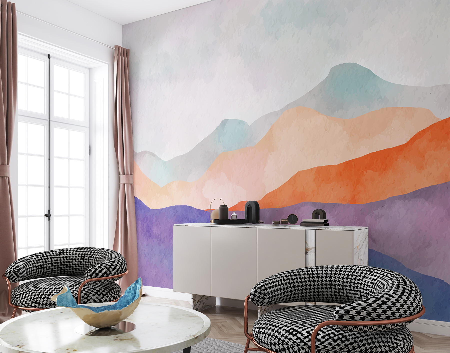 Premýšľali ste niekedy o prechádzke akvarelovou krajinou snov priamo vo vašej obývačke? Presne takú atmosféru vám poskytne táto nástenná maľba. Akoby niekto zachytil esenciu jemného, hmlistého rána v horách a rozprskol ju po vašej stene. Zmes farieb je taká upokojujúca – pastelová modrá, jemná oranžová a fialová, ktoré sa spájajú ako pokojný západ slnka. Predstavte si, že popíjate kávu, pozriete sa hore a okamžite sa cítite uvoľnene – takmer akoby ste sa pozerali z okna chaty na vzdialené vrcholy. Ideálne pre každého, kto miluje dobrú atmosféru prírody.