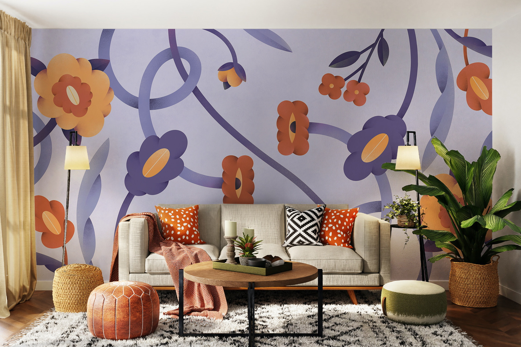 “Nástenné maľby Fialové a oranžové kvety a vinič” je ako vstúpiť do veselej, zasnenej záhrady. Tie prepletené liany a kvety vo výraznej fialovej a slnečnej oranžovej farbe priam sršia energiou. Predstavte si, že sa zobudíte na túto žiarivú scénu – okamžité zlepšenie nálady! Je to ako mať kúsok leta priamo na stene bez ohľadu na ročné obdobie.