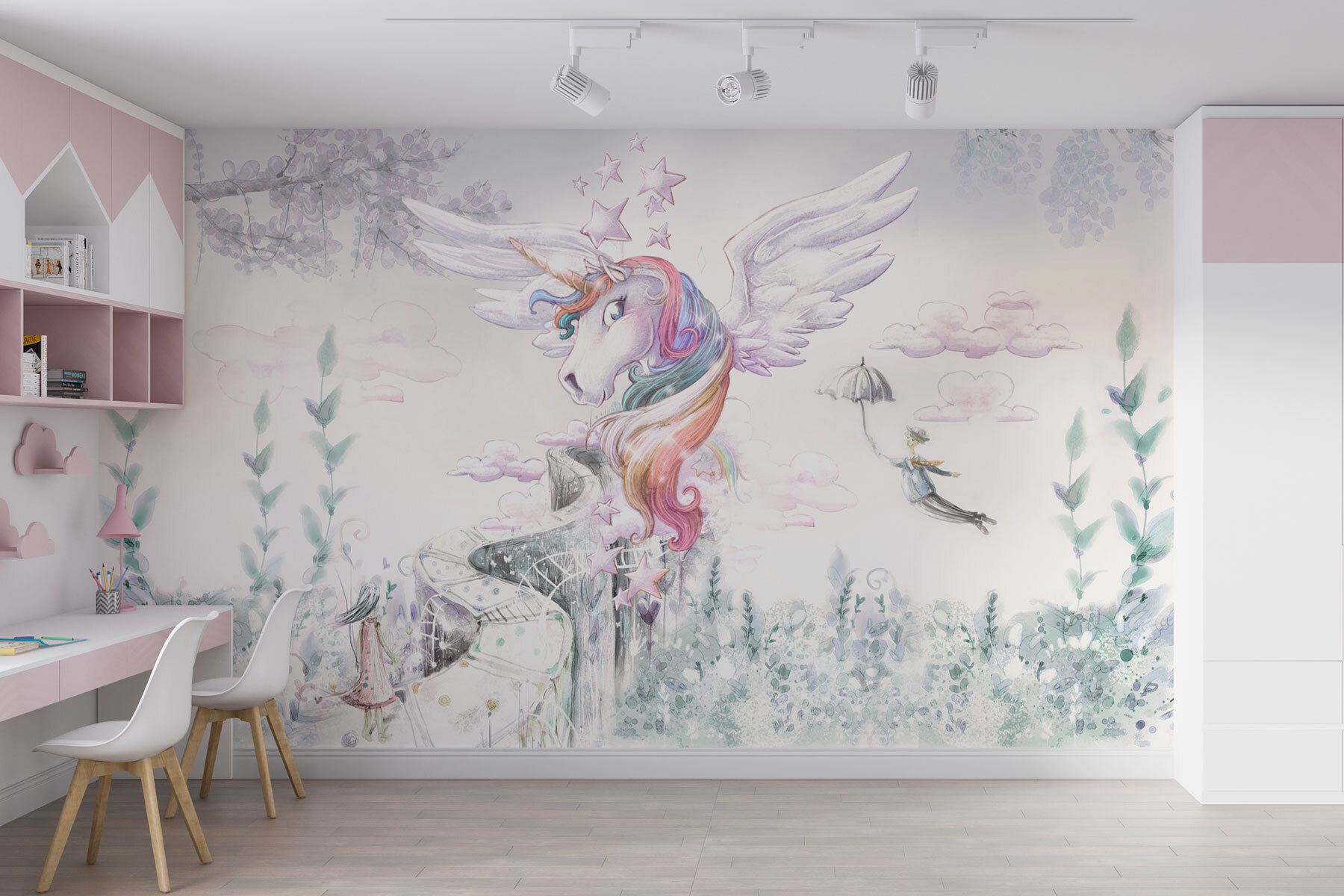 Hľadáte v detskej izbe kúzlo? Pozrite si túto nástennú maľbu “Jednorožec s krídlami a dúhovými vlasmi”! Predstavte si, že sa zobudíte na scénu priamo z rozprávky – rozmarný jednorožec s vlajúcimi pastelovými dúhovými vlasmi, obklopený jemnými oblakmi a trblietajúcimi sa hviezdami. Je to ako sen každého dieťaťa, namaľovaný na jeho stene! Táto nástenná maľba sa krásne hodí do detských izieb a izieb malých detí, aby mali pocit, že skočili do svojej obľúbenej rozprávkovej knihy. Sladko nenápadná, ale úplne očarujúca – vyvoláva radosť a nekonečné príbehy. Perfektne sa hodí do krajiny zázrakov pre najmenších alebo do útočiska každého milovníka jednorožcov! 🌈🦄