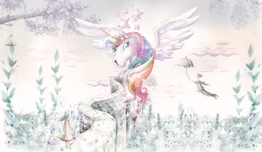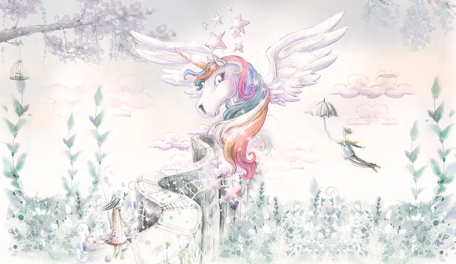 Hľadáte v detskej izbe kúzlo? Pozrite si túto nástennú maľbu “Jednorožec s krídlami a dúhovými vlasmi”! Predstavte si, že sa zobudíte na scénu priamo z rozprávky – rozmarný jednorožec s vlajúcimi pastelovými dúhovými vlasmi, obklopený jemnými oblakmi a trblietajúcimi sa hviezdami. Je to ako sen každého dieťaťa, namaľovaný na jeho stene! Táto nástenná maľba sa krásne hodí do detských izieb a izieb malých detí, aby mali pocit, že skočili do svojej obľúbenej rozprávkovej knihy. Sladko nenápadná, ale úplne očarujúca – vyvoláva radosť a nekonečné príbehy. Perfektne sa hodí do krajiny zázrakov pre najmenších alebo do útočiska každého milovníka jednorožcov! 🌈🦄