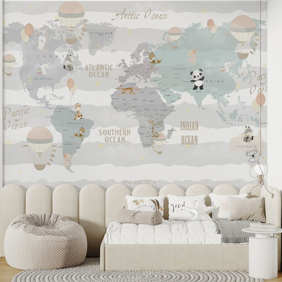 Táto rozkošná nástenná maľba “Horkovzdušný balón na oblohe” unesie fantáziu vášho dieťaťa na magické dobrodružstvo. Predstavte si mapu sveta, krásne jemnú a pastelovú, pokrytú tými najroztomilejšími zvieratkami v teplovzdušných balónoch – je tu dokonca aj hravá panda a zvedavá žirafa! Je to ako svetové safari priamo na stene. Táto nástenná maľba, ktorá je ideálna do detskej izby alebo hravej detskej izby, podnecuje k úžasu nad veľkým, širokým svetom. Zaručene inšpiruje k rozprávkam pred spaním o lietaní nad šumiacimi oceánmi a pristávaní vo vzdialených krajinách. Ideálna pre malých objaviteľov – rodičia sa možno tiež pristihnú pri snívaní. Je útulný, rozmarný a plný šarmu – presne taký, aký potrebuje každý detský priestor!