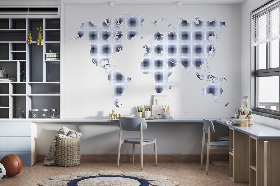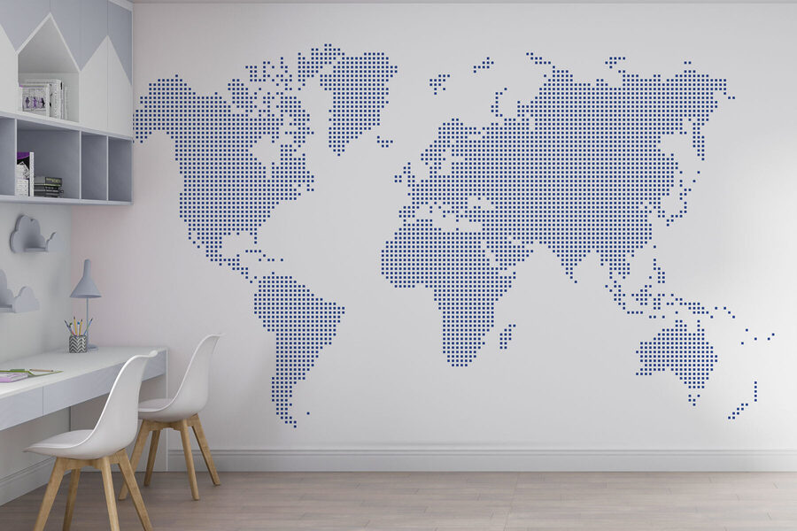 Premýšľate o vylepšení svojho priestoru? Pozrite sa na túto hviezdnu nástennú maľbu s názvom “Mapa sveta”. Je to elegantné, umelecké prevedenie typickej mapy s množstvom drobných bodiek, ktoré tvoria kontinenty. Táto nádhera sa umiestnila v kategóriách “Nástenné maľby s mapou Zeme” a “Populárne nástenné maľby” a je ľahké pochopiť prečo. Predstavte si, že sa tiahne cez celú stenu vašej obývačky – určite začne konverzáciu! Predstavte si hostí, ktorí obdivujú vašu globálnu atmosféru a nenútene plánujú svoje ďalšie dobrodružstvo. Navyše je niečo zvláštne uspokojujúce, keď vidíte takto rozložený svet. Pridáte túto nástennú maľbu do svojho priestoru? Je to ako pozvať celý svet k sebe domov.