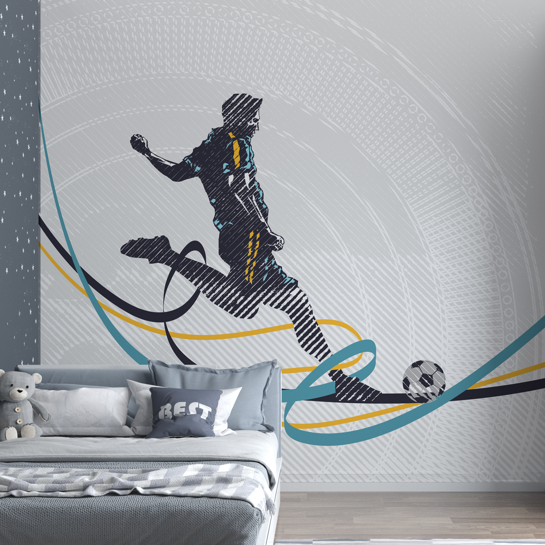 Ahoj! Máte prázdnu stenu, ktorá si priam pýta nejakú osobnosť? Pozrite si toto – je to nástenná maľba chlapa, ktorý kope do futbalovej lopty. Celkom dynamické, čo? Z tohto diela priam kričí energia a pohyb, akoby ste takmer počuli, ako dav reve. Predstavte si to vo svojej mužskej jaskyni alebo dokonca v detskej izbe – určite to inšpiruje nejaké vážne futbalové sny!