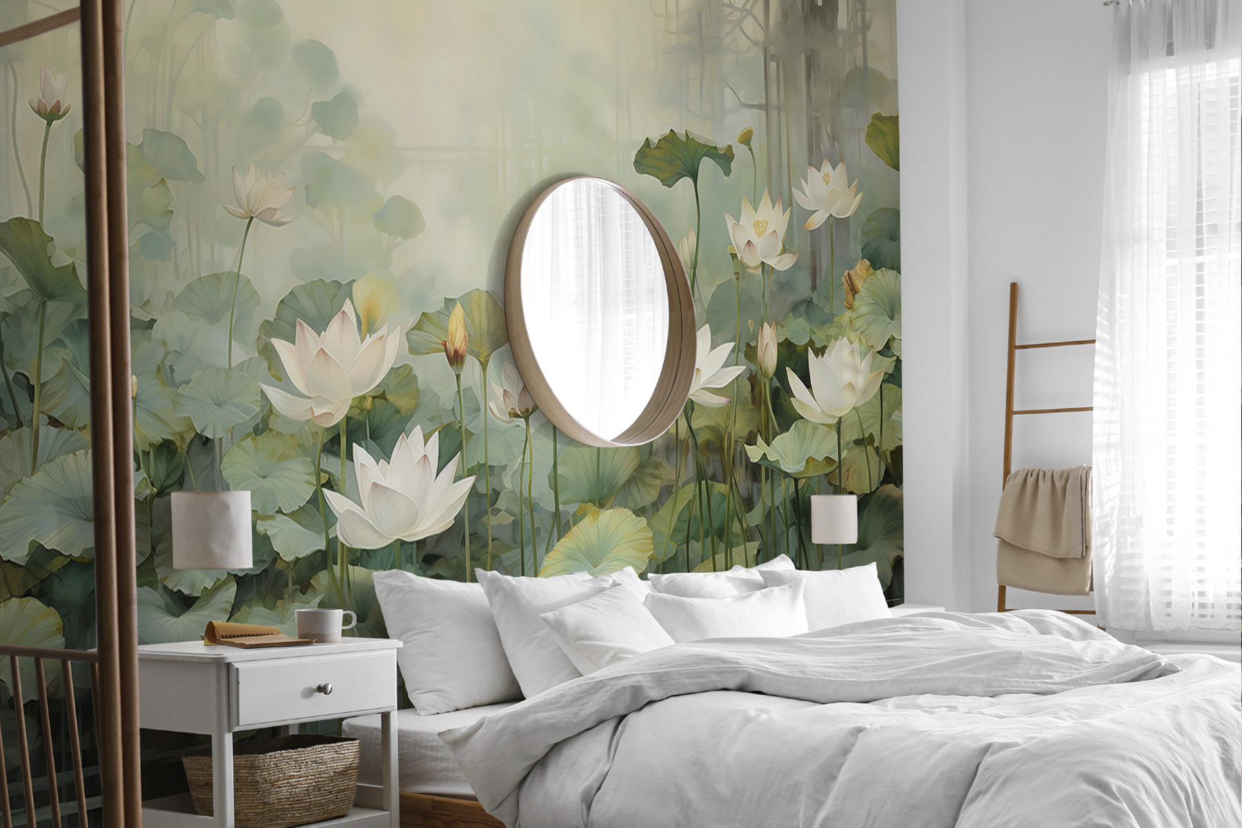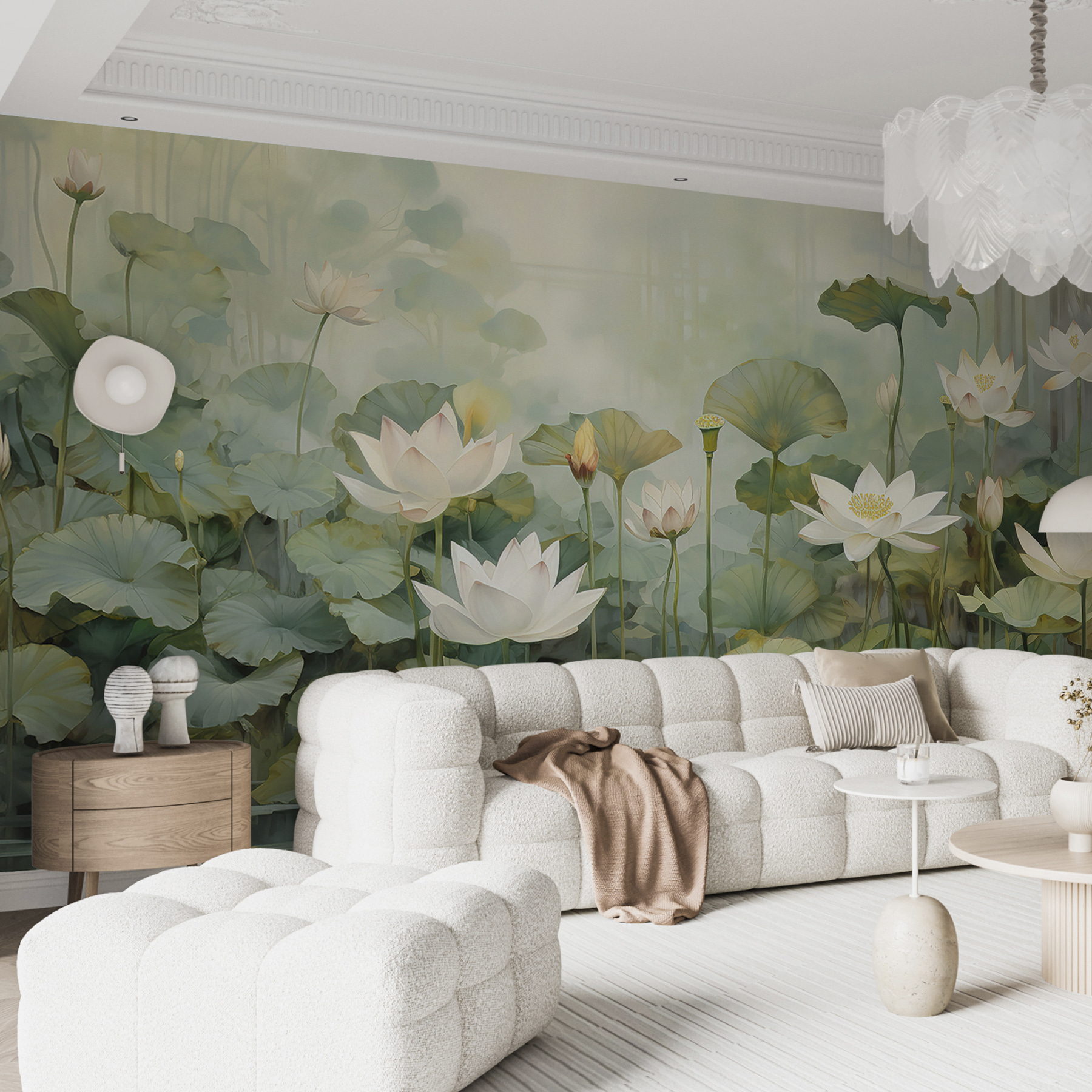 Predstavte si, že vstúpite do pokojnej svätyne s touto očarujúcou nástennou maľbou pokojného rybníka posiateho jemnými kvetmi a obklopeného sviežou zeleňou. Je to ako preniesť pokojné útočisko priamo do vášho domova. Jemné odtiene vás pozývajú k zastaveniu a nadýchnutiu a navodzujú pocit lenivého popoludnia pri pokojnom jazere. Predstavte si šálku čaju a dobrú knihu v ruke, stratení v kráse prírody bez toho, aby ste opustili miestnosť. Táto fototapeta, ideálna do útulného obývacieho priestoru alebo tichého čitateľského kútika, šepká relaxáciu a nádych rozmarnosti, vďaka čomu sa každá stena bude cítiť ako okno do čarovnej záhrady.