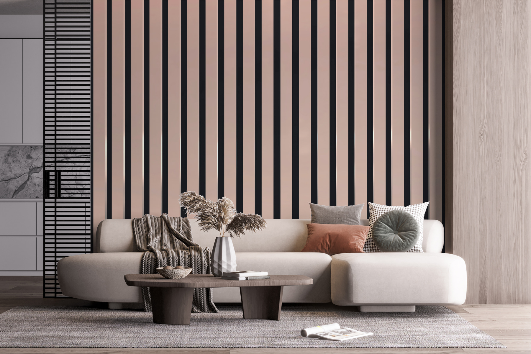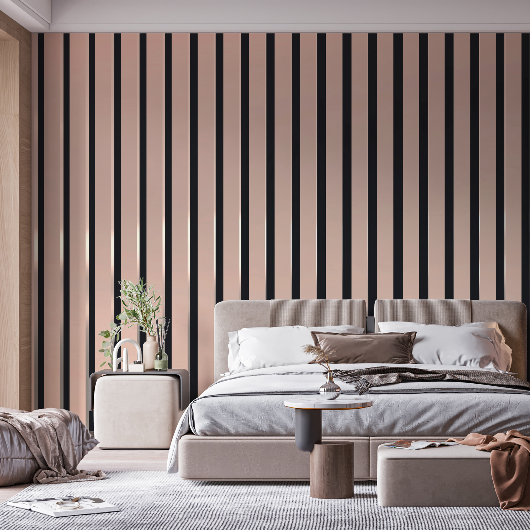 Predstavte si, že vstúpite do priestoru, ktorý je vďaka tejto vertikálne pruhovanej nástennej maľbe ľahký a svieži. Predstavte si tieto elegantné línie, ktoré sa tiahnu od podlahy až po strop a vytvárajú plynulý tok, ktorý nabáda k relaxácii. Je to ako jemné objatie vašich stien – zároveň príťažlivé a elegantné. Tento dizajn, ktorý je ideálny pre útulný čitateľský kútik alebo elegantnú obývaciu izbu, bez námahy dodáva záujem bez toho, aby zahltil. Priatelia vojdú, obzrú sa a povedia: “Páni, toto miesto má štýl!” Premeňte svoj priestor s nádychom moderného šarmu a nechajte tieto pruhy pôsobiť čarovne!
