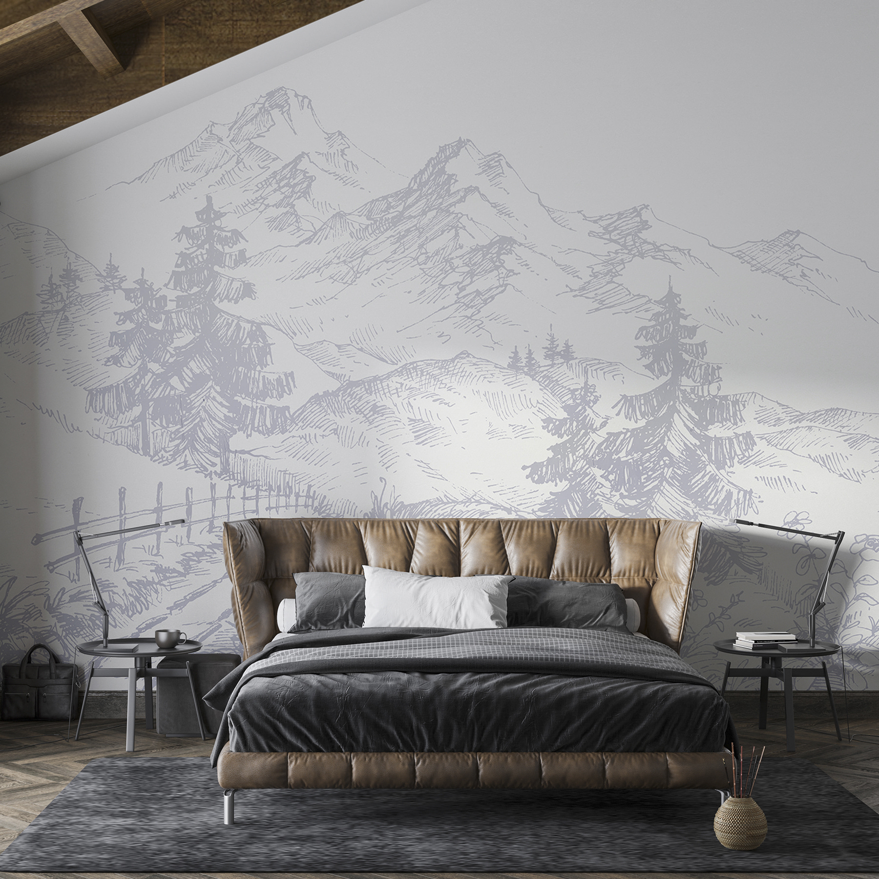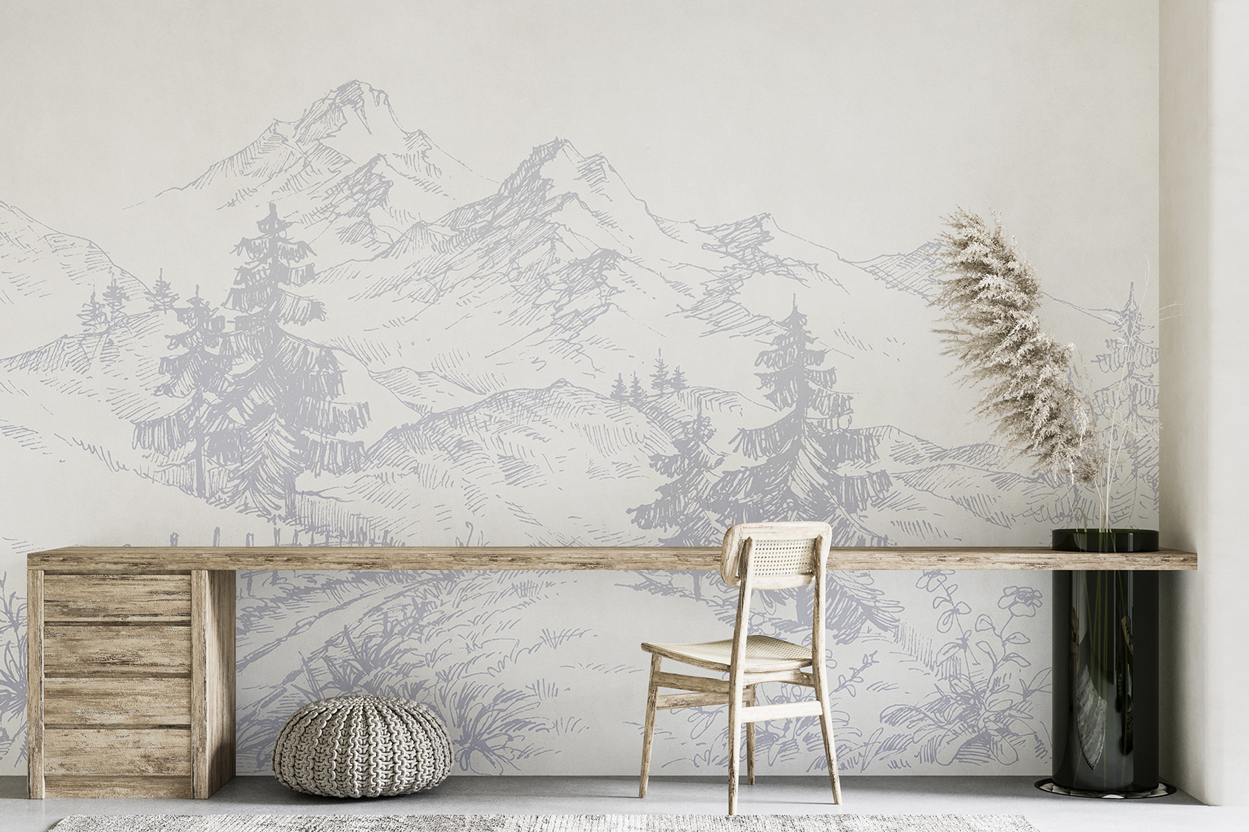Čo tak vniesť do svojho obytného priestoru nádych prírodného umenia pomocou tejto nástennej maľby s ručne kreslenou rastlinnou scénou? Predstavte si, že sa okamžite prenesiete na pokojnú horskú cestu s vysokými stromami a miernymi zvlnenými kopcami. Je to ako mať výhľad, ktorý zmení vašu náladu zakaždým, keď sa naň pozriete. Jemný štýl náčrtu ceruzkou mu dodáva nadčasové čaro – niečo ako staré rozprávkové knihy, ktoré ste ako dieťa nemohli odložiť.